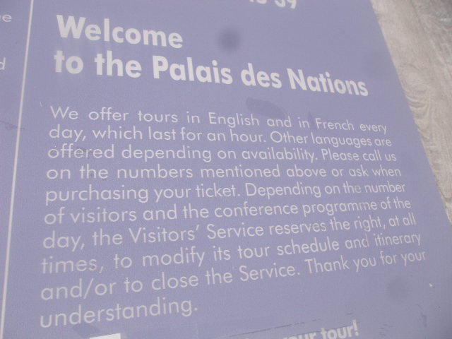ジュネーヴ観光のハイライトともいえる、パレデナシオン(国連ヨーロッパ本部)のツアーに関してですが、私はまさか休業期間があるとは思わずに、時間だけ合わせて訪問して、現地にてツアー休業期間のことを知りました。毎年状況は変わるようですが、少なくとも2016年は12月の半ばから、翌年1月の初めまで、約3週間のツアー休業期間が設定されていましたので、是非ツアーに参加したい、という方は、その近辺の日程に休業期間がないか、予めお調べになってから現地に向かわれた方が良いかと思います。尚、ツアーの申し込みに関しては、壊れた椅子のある正門側ではなく、左手を迂回してアリアナ美術館の方に進んだ門で行っています。