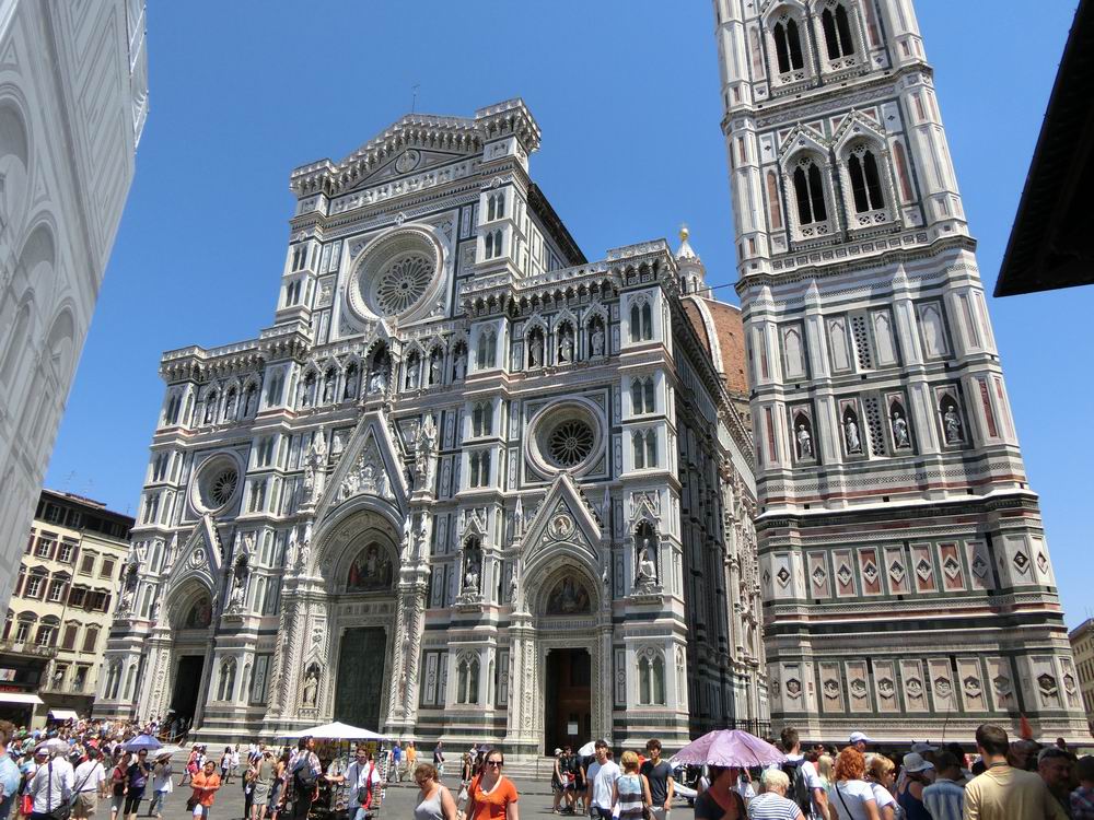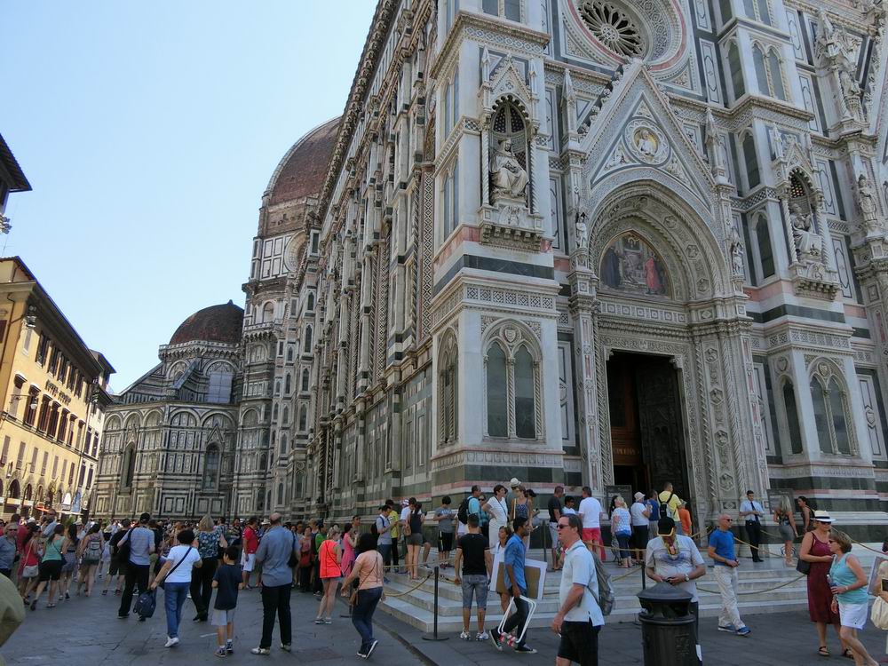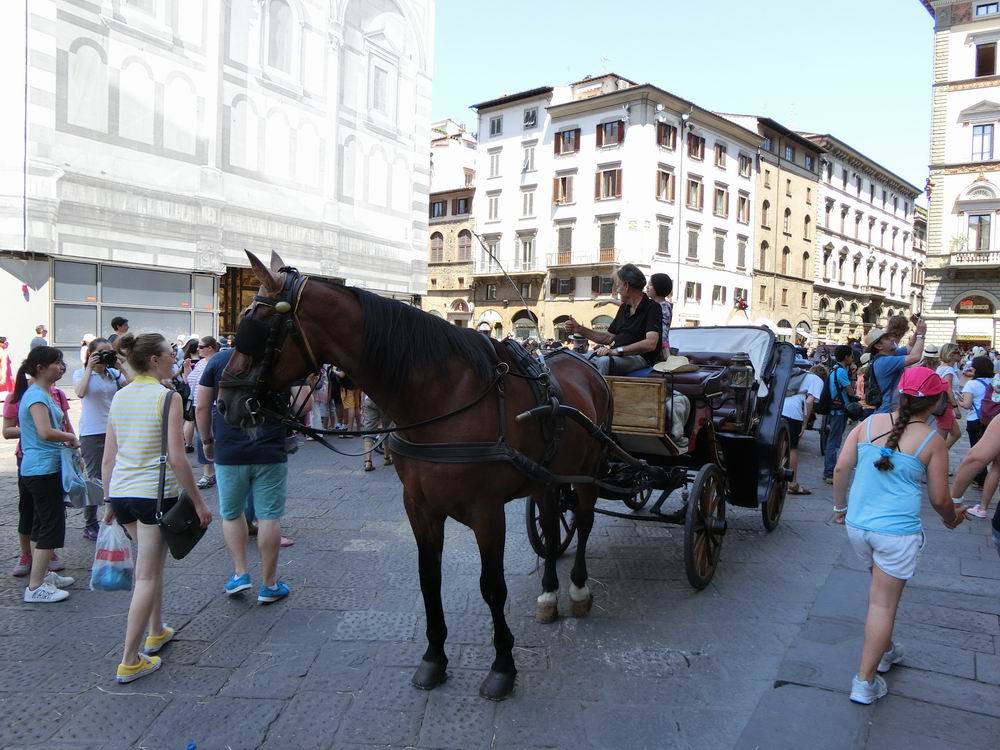 ドゥオーモ、ジョットの鐘楼、洗礼堂などに囲まれた広場は、そんなに広くはないと思うのですがとにかく観光客が多くて混んでます。観光客目当ての馬車まで出ていました。ドゥオーモも鐘楼も大きな建物なので、全部を写真に収めるのに苦労しました。