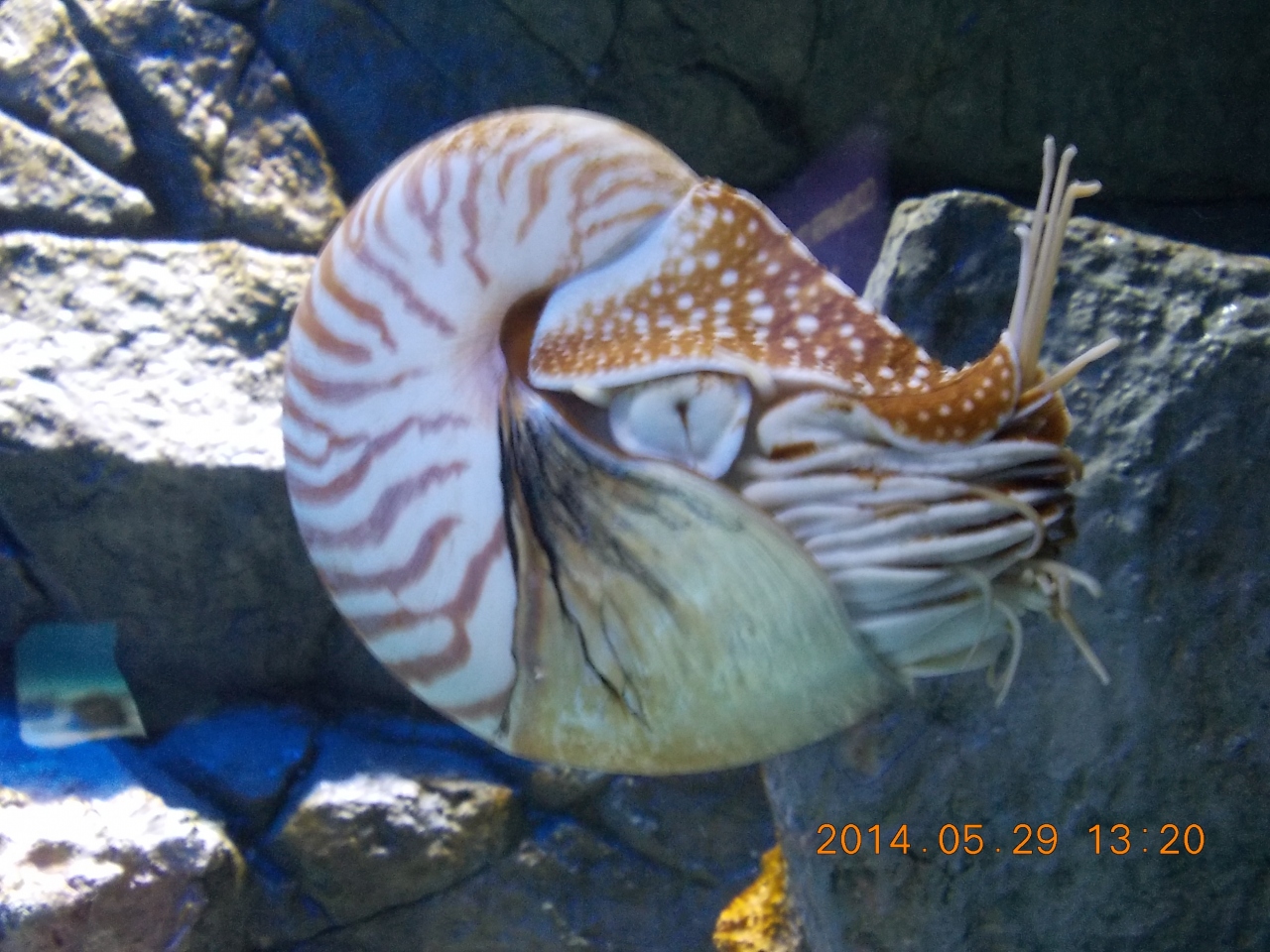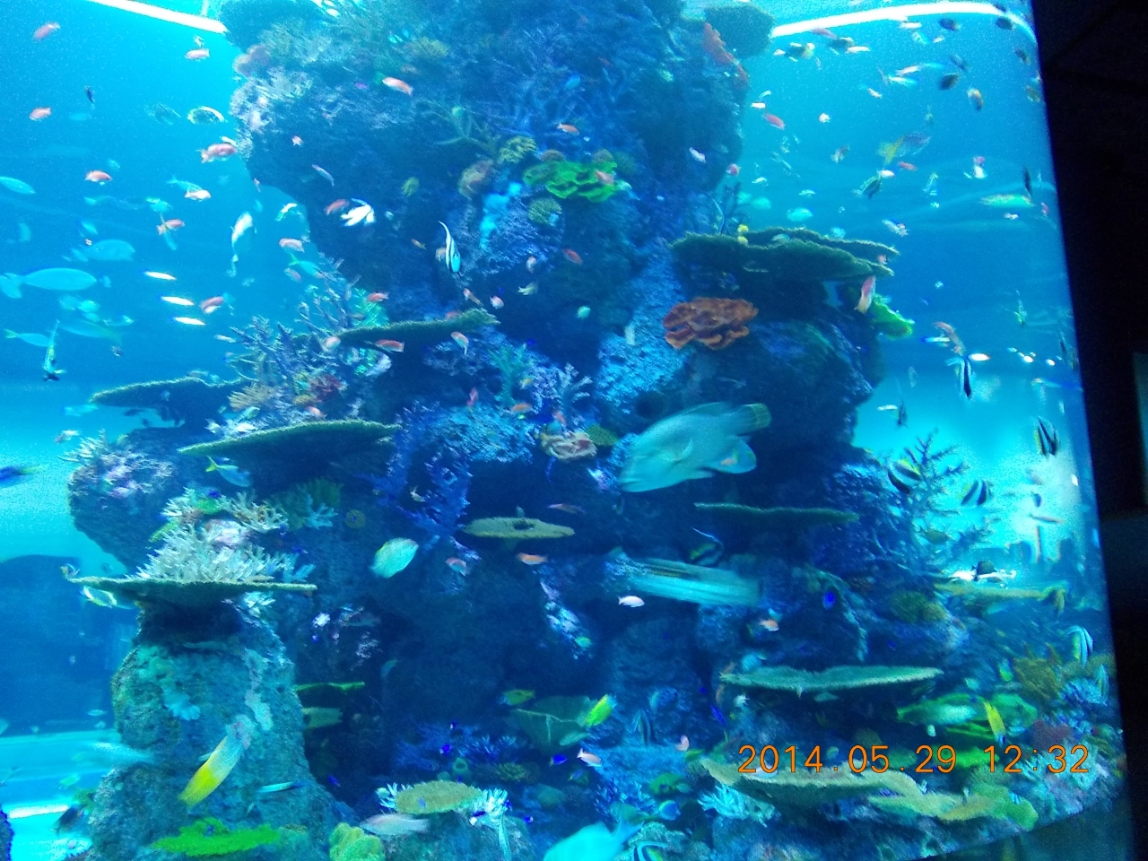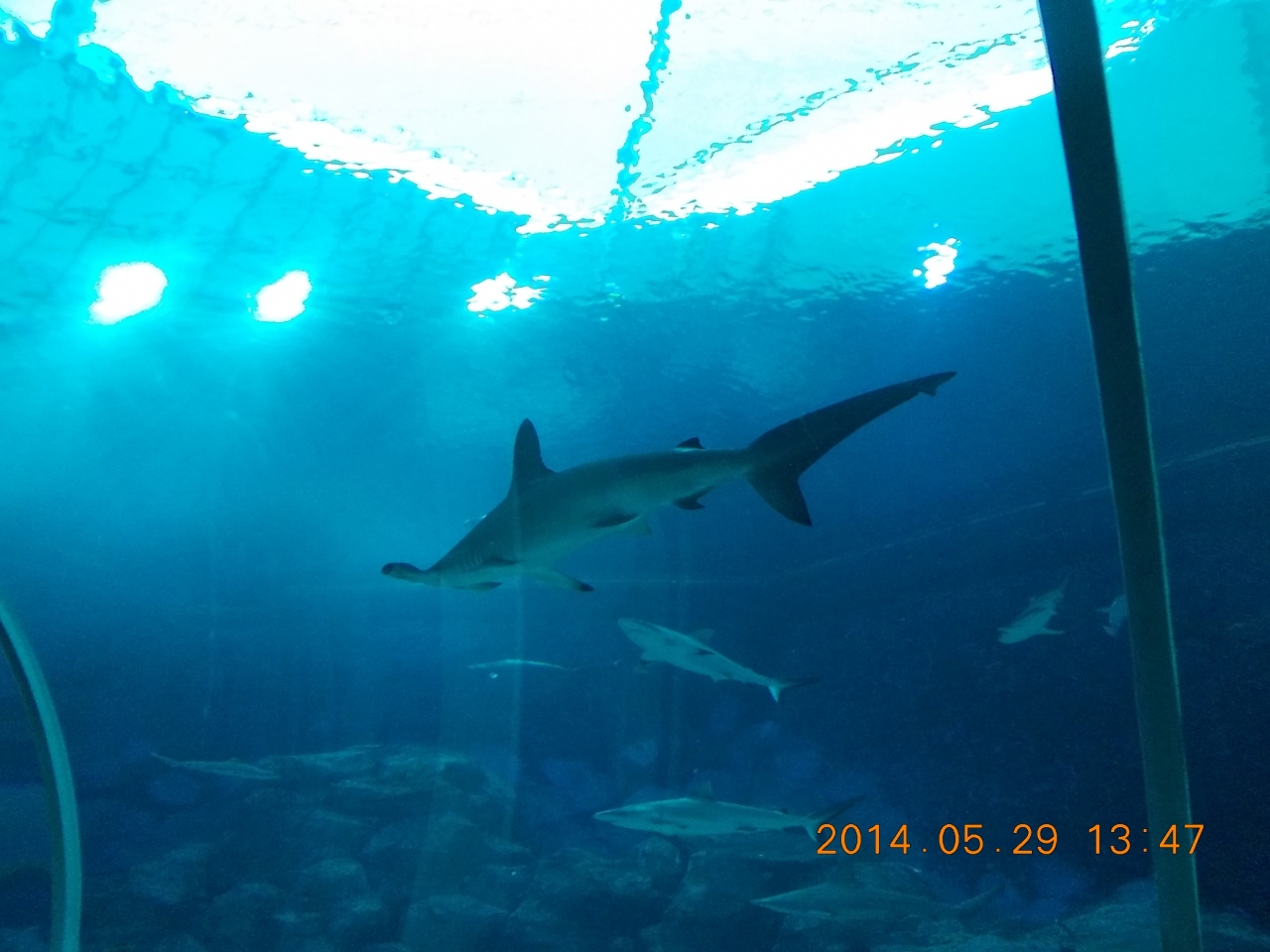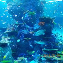中に入ると、まず上下左右を水槽に囲まれた中を歩いていく。至る所に魚がいて、楽しい空間である。進んでいくと、イルカやオウムガイなど、色々な生物が展示してあった。一番奥に行くと巨大な水槽があり、小さな魚が群れを成して泳いでいたり、大きな魚が悠々と泳いでいたりと、気持ち良さそうであった。熱帯魚の展示では、色とりどりの魚が泳いでいて綺麗である。出口の前に、トンネル状のサメの展示スペースがあり、上を悠々と泳ぐサメや、水槽の壁に寄って横たわっているサメ等色々な種類が居て面白い。