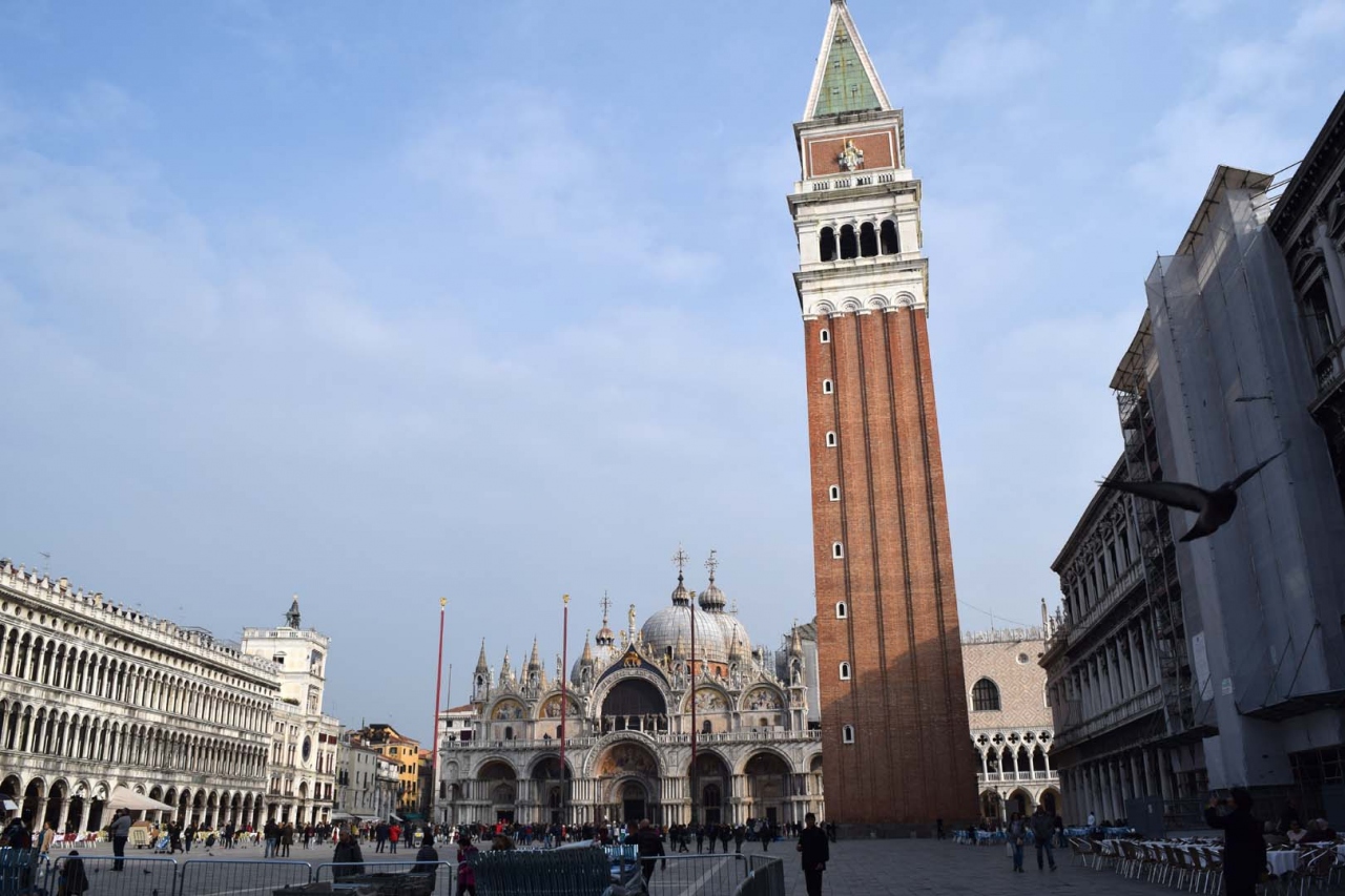 狭い街中の路地にあるブランド店街を抜けると約100mの高さという大鐘楼が目に入る広場に到達します。ここがサン・マルコ広場で大鐘楼の奥にサン・マルコ寺院、L字形に曲がる小広場の脇にはドゥカーレ宮殿があり、広場周囲の回廊にはカフエやショップが建ち並び、見て回るだけでも時間がかかります。