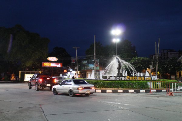 北パタヤバスターミナルからノースパタヤロードを西に行くと、ドルフィンサークルに突き当たります。基本的には五差路になるのでしょうか、ビーチロードとセカンドロードとも交差しているので、地理的に抑えておきたいところです。環状交差点にも関わらず、ドルフィンの周りに自動車が停車していたりします。近くまで寄れないことはないのでしょうが、飛ばしているクルマもあるし辺りも暗かったのでやめておきました。明るすぎない青い仄かな電飾でした。