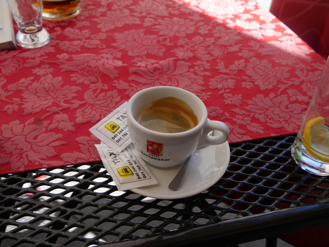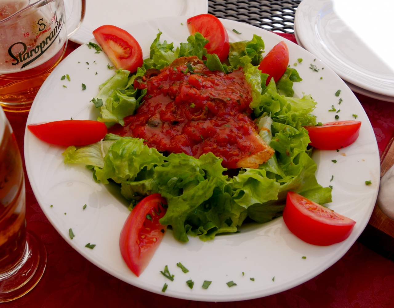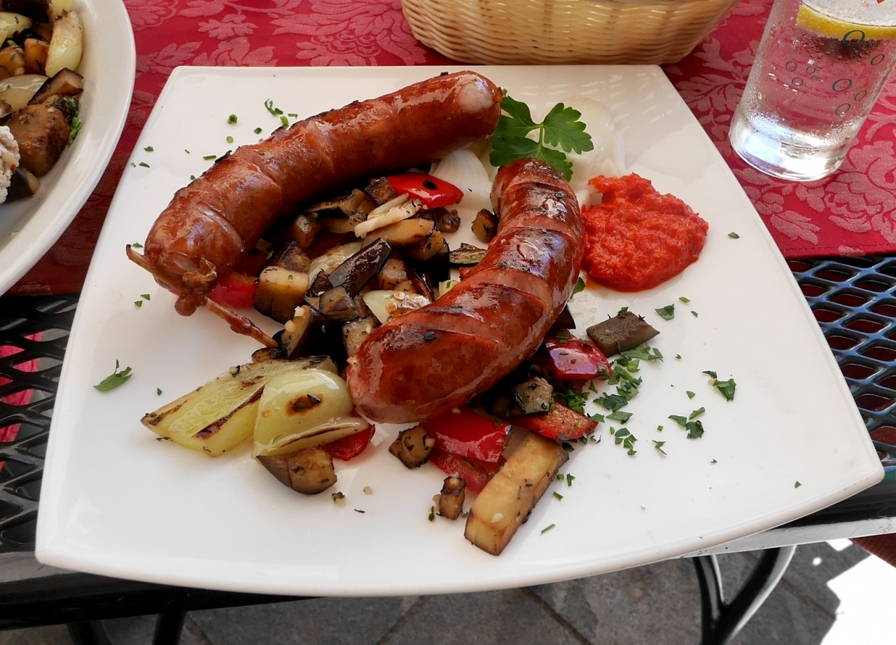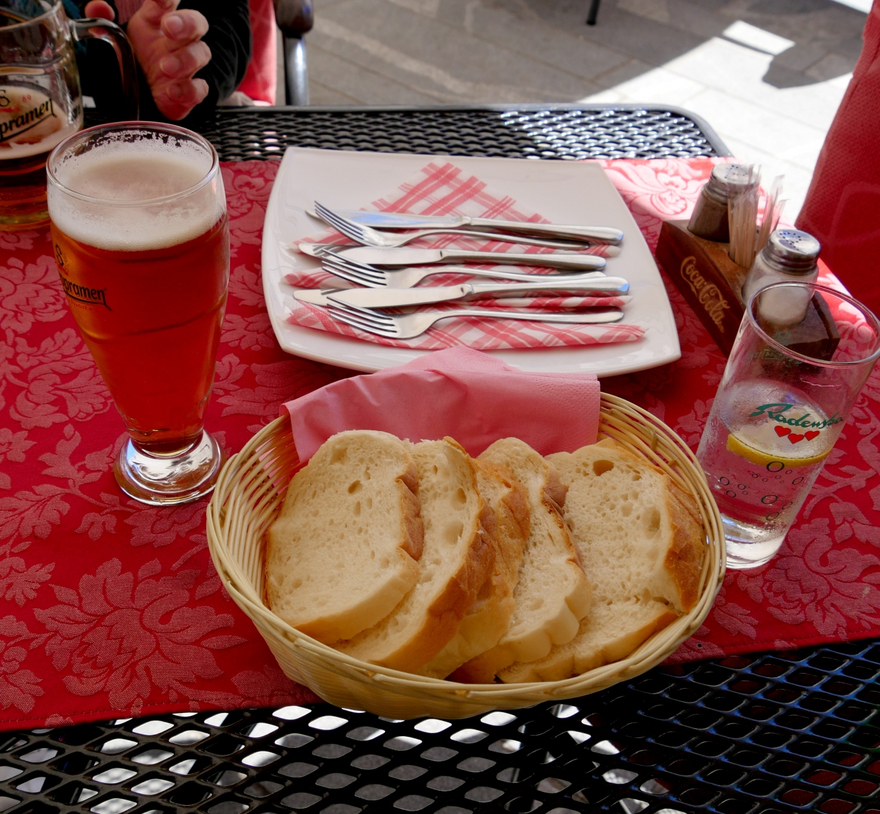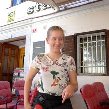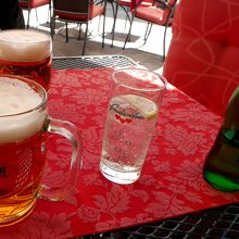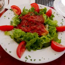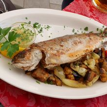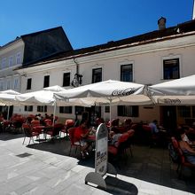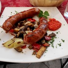 ランチに寄った.Glavni広場のタウンホールの前にあるレストラン.スロベニアソーセージ,地中海サラダ,ますのトリエステ風焼きを食べた.ビール2本などを含め全部で3人で36ユーロととても安い!スロベニアの山も見えるし,広場の空気もいいし,郷土料理を食べるにはとてもいいレストランだ!