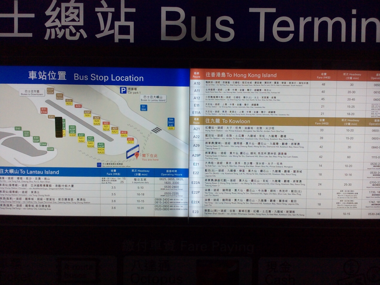 空港から香港(上環)までの移動はエアポートエクスプレス(AEL)が一般的だと思いますが、今回はシティバスのE11系統を使ってみました。2階立てで香港っぽくてよいですし、AELだと料金が70HKDですがシティバスは21HKDでかなり安いです。またA11系統を使えば40HKDしますがE11系統より速く、シートの質もいいみたいです。空港からマカオフェリーターミナルに直行する場合、バスはフェリーターミナルのすぐ前まで行くことができます。AELは香港駅からフェリーターミナルまで大分歩かないといけないので、それを考えるとバスの方が便利だと思います。空港のバス乗り場は案内に従って進めば大きな系統番号ののりば案内板にたどり着きますが、系統がたくさんあるので番号は事前調べておかないとよくわからないと思います。支払いはAELと同じくオクトパスカードです。ちなみに私は前回香港に行った時に買ったオクトパスカードを持って行ったのですが、古すぎたためかチャージ機でチャージできず(無効なカードと表示)、AELの有人窓口で買いなおそうとしたら、古いカードをそのまま有効にできるということでした。長期間使わな買ったカードでも一旦窓口に持っていけばよいみたいです。