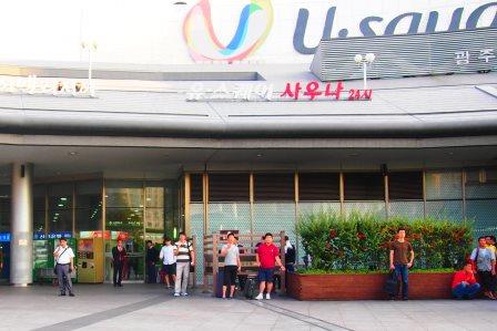 仁川空港から乗って来た高速バスが到着した光州のバスターミナル。たくさんのショップが入り、フードコートもあって、日本で言えば…どこなんだろう?鉄道駅とは独立しててこの規模でとなると、熊本にあった交通センターくらいですか。鳥が羽根を広げたような曲線を描く建物正面は大きな広場になっていて、自分が到着したときには、子供たちのダンスカーニバルのようなイベントが催されていました。光州市民が集まるスペースという役割も持っているようです。
