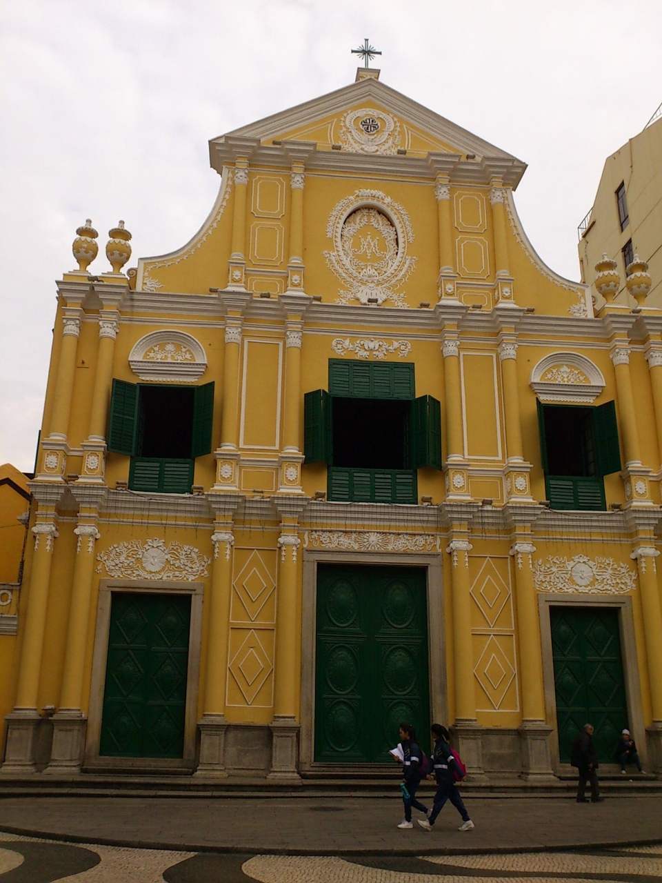 セアド広場の一番奥にある教会です。黄色のパステル・カラーの外観に市陸縁取りされた姿がとても印象的です。マカオにはたくさんの世界遺産がありますが、これも世界遺産の一つです。この聖ドミニコ教会に限らず、マカオの有名な建物はパステルカラーが多く、独特な雰囲気を醸し出しています。