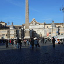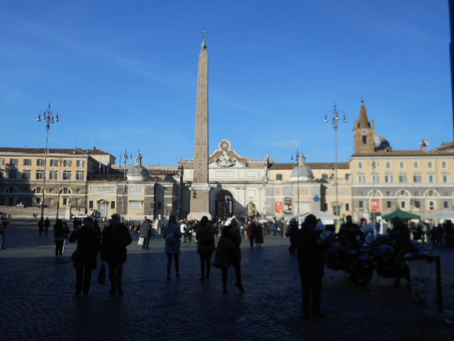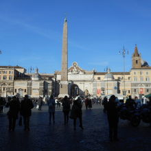 スペイン広場の前のバブイーノ通りやゴルドーニ広場のコルソ通りを北東に向かって歩くと楕円形のポポロ広場に出ます。ポポロとは”人民”の意味で、中世以降ローマの表玄関でポポロ門があり、軍隊等がここからローマに入る表玄関だったそうで、中央にエジプトから運んだ高さ24メートルもある、オリベスクが立っています。広場周りにはカフェ、レストランもあり、人出が多いわりには、のんびりできるエリアでした。