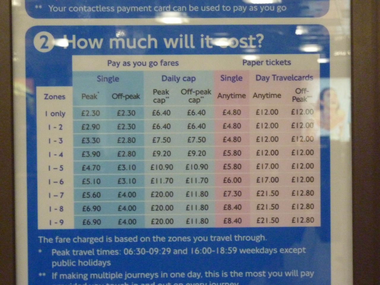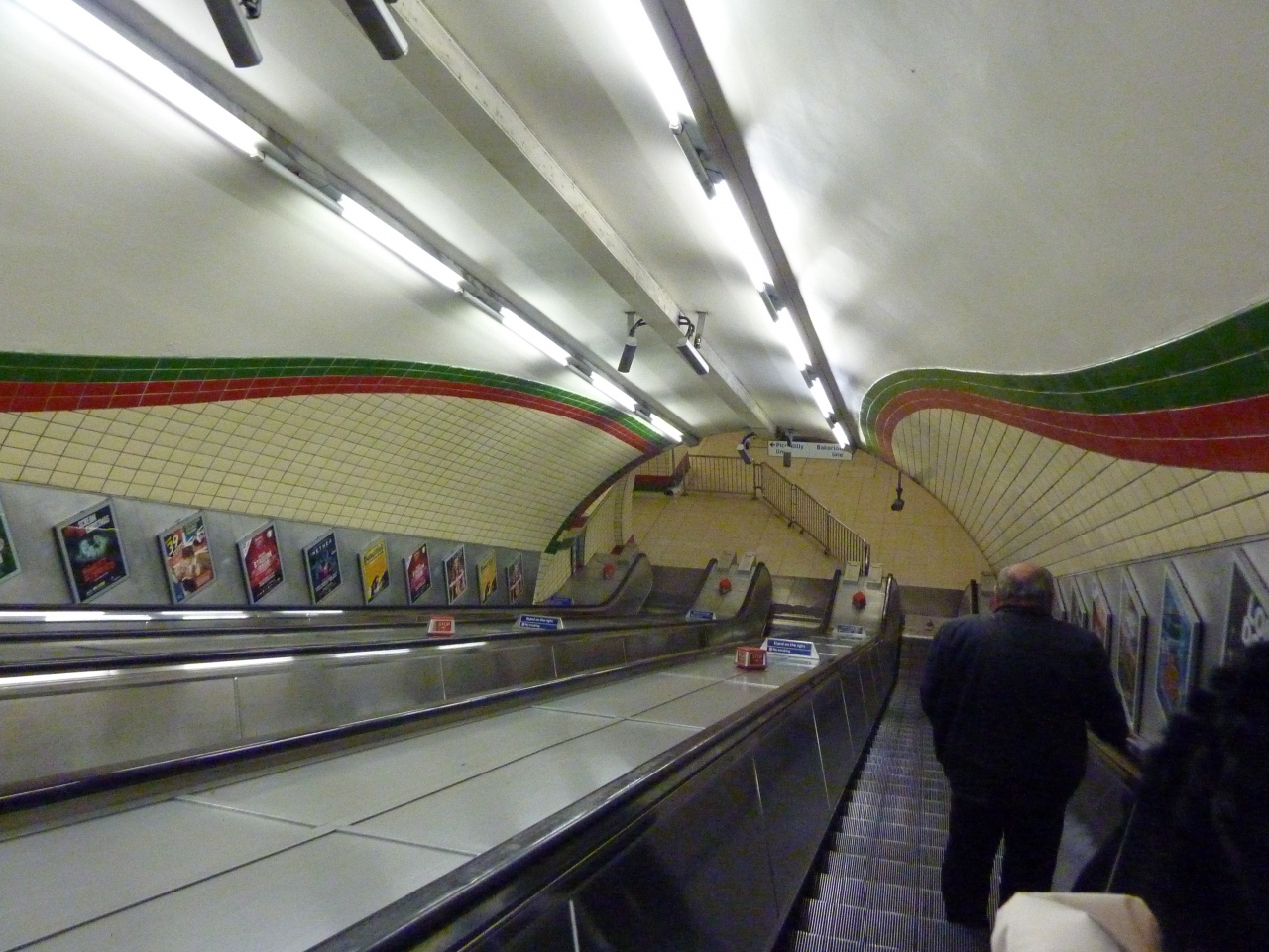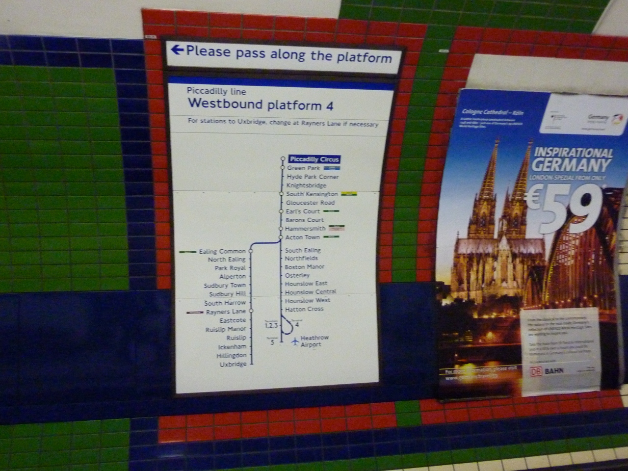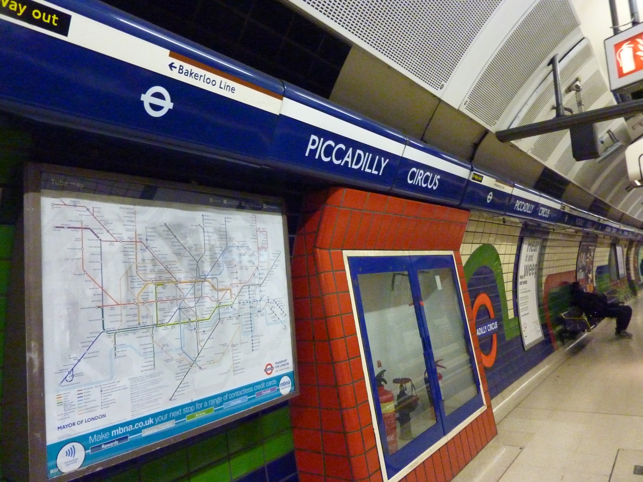 ピカデリーサーカスにあるチューブの駅でピカデリーラインでヒースロー空港まで直行できます。繁華街にある駅ですが、近に降りるまでは階段しかなく、大きな荷物を持って移動するのはちょっと大変かも。地下に降りると、今度は長いエスカレーターを乗り継いでホームのレベルまで降りていきます。ベーカーラインとの乗換駅ですが、ホームの案内も沢山あり、解りやすくなっています。ホームの天井は丸くなっていて、列車の形と同じ様に角が無いので少し狭く感じます。駅構内は全体に良く清掃されていました。
