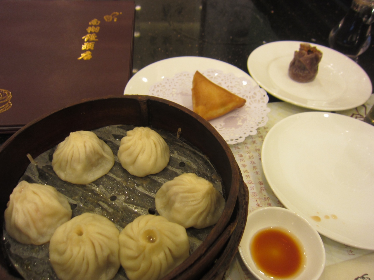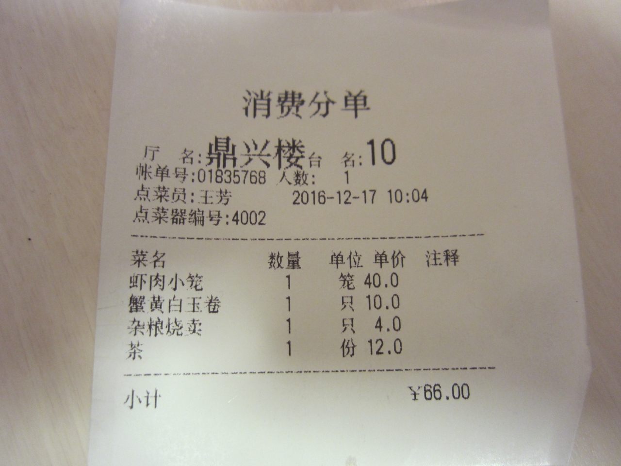 豫園のすぐ隣にある小籠包のお店。入口にできていた長い列はテイクアウトの列でした。イートインのお客さんは次々と中に入り、階段で2階へ。階段を上りすぐ左にレジがあり注文する人たちが並んでいましたが、かかっているお品書きは中国語で読めず、うろうろしているともう少し高級そうな席のある場所が。こちらでは日本語のメニューもあり、席で注文。後でわかったことですが、ここのお店はグレード別に3つの庁があり、最初の所が船舫庁で一番下のグレード、階段を上って右に行き、長興楼・鼎興楼というお店があり、グレードが上がっていくそうです。鼎興楼の最低消費額は80元とのことですが、それを知らずに消費した額は66元でした。お店の人も別に何も言わずに普通に会計してくれました。