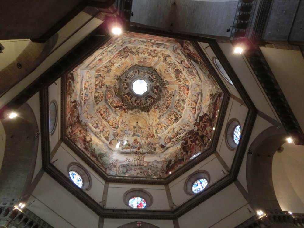 内部は思ってたよりも装飾が少なくガランとしてました。そんな中でも、クーポラ部分のヴァザーリらによるフレスコ画「最後の審判」は見事なので必見。その下の丸窓部分は外から見ると気付かなかったですがステンドグラスになっていました。