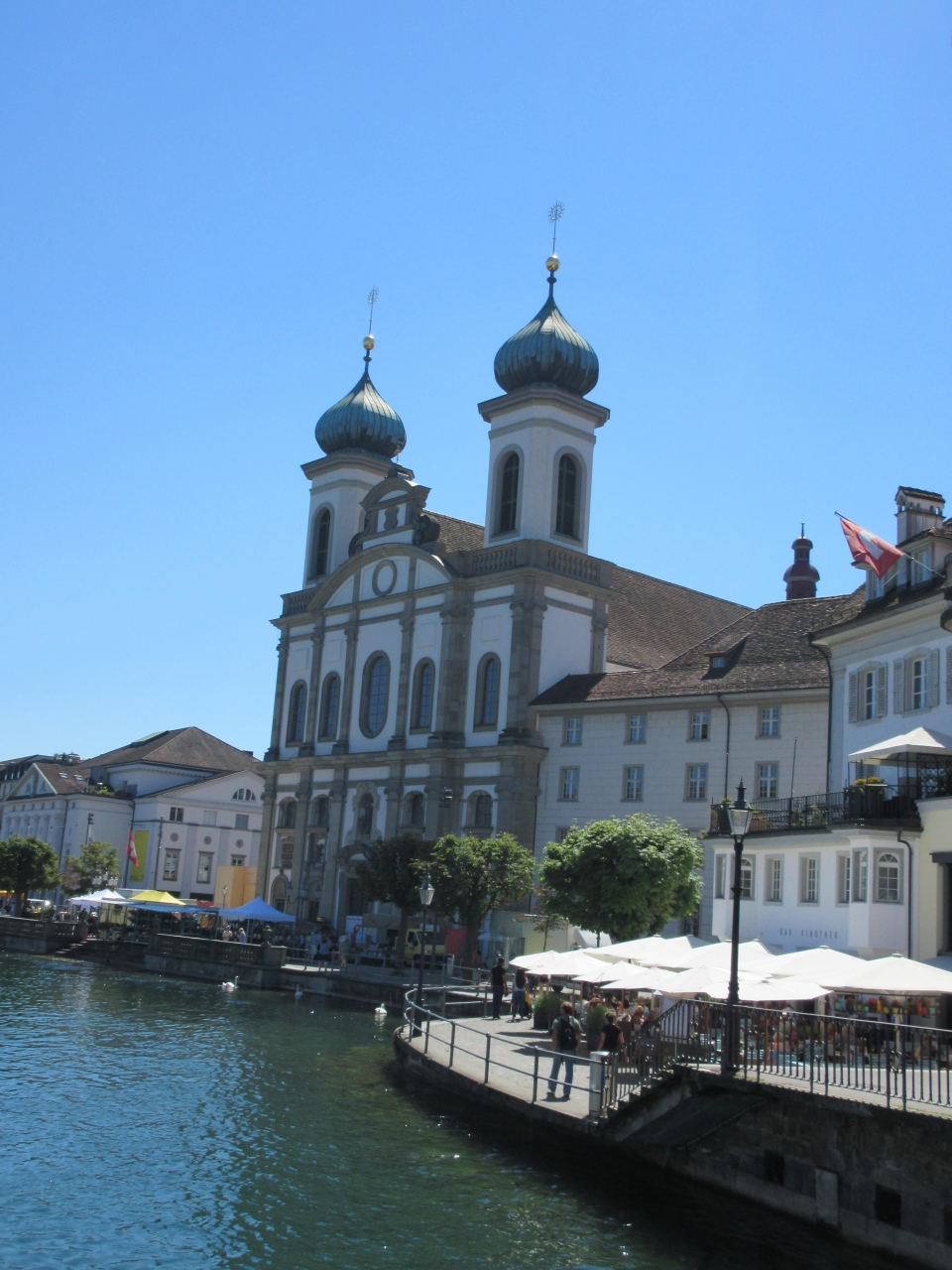 ルツェルン湖の河口、カペル橋の近くにある。ホープ教会のとがった屋根とは対照的である。向かい合った感じで建てられているので面白い。宗教改革当初に反改革派の中心であったルツェルンならではの光景ということである。