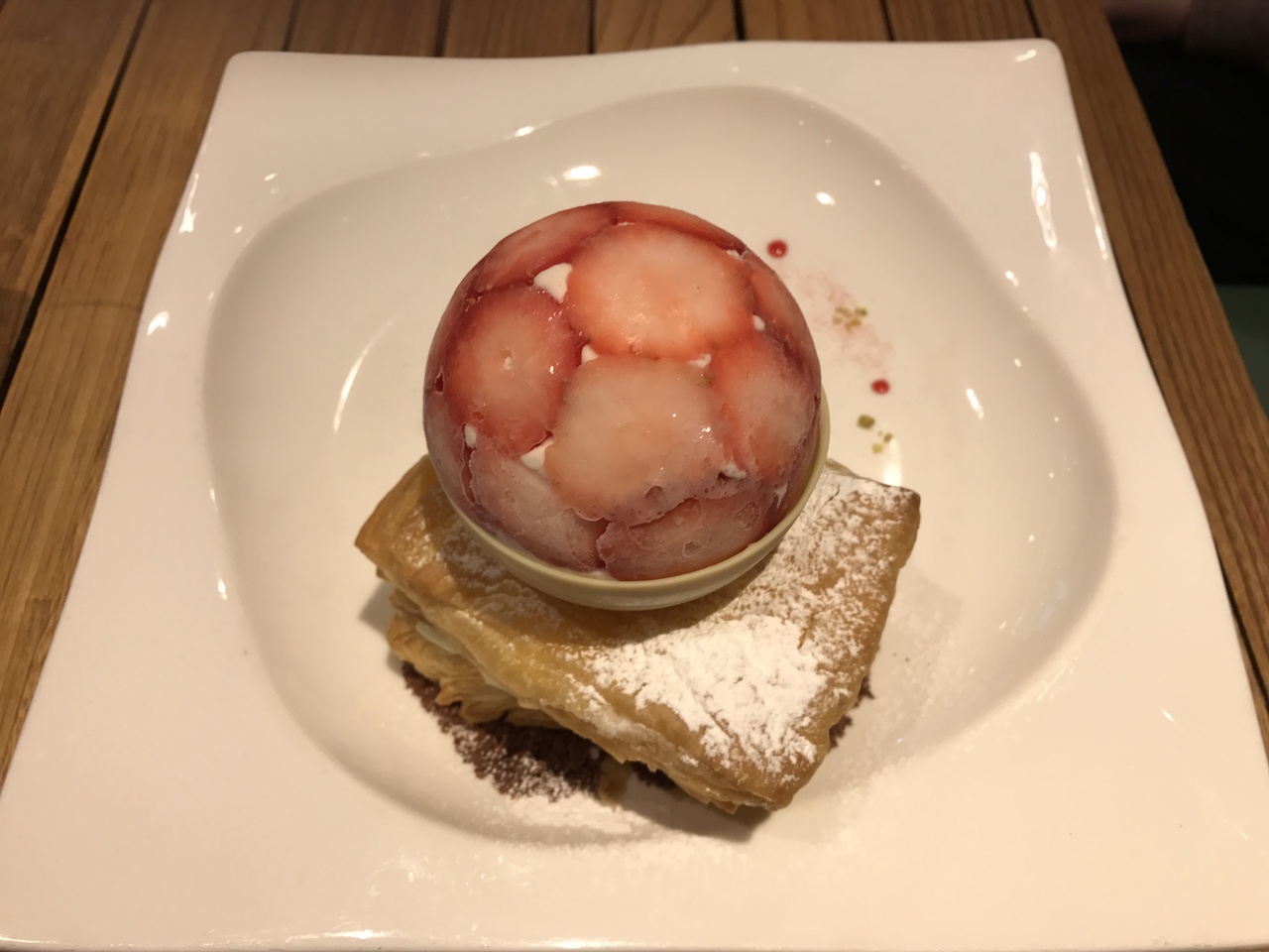 パイの上にバニラアイスとイチゴがホワイトチョコのカップに入ってて、上からイチゴソースをかけていただきました。