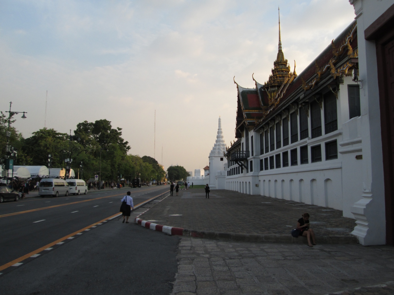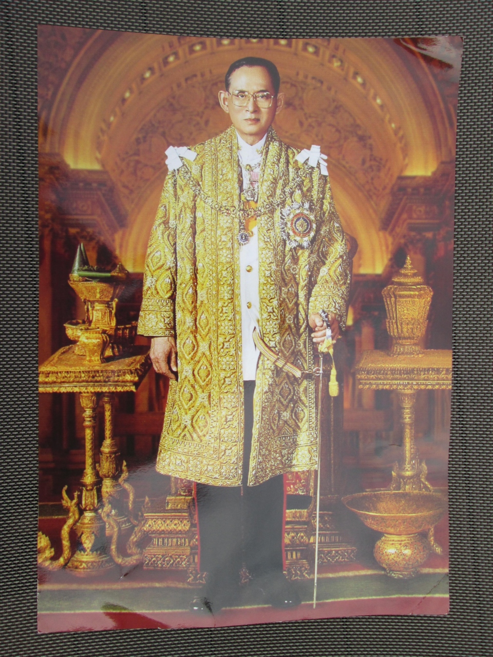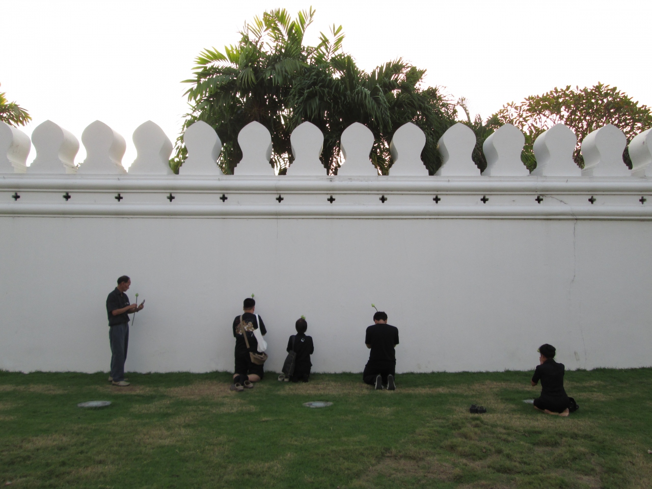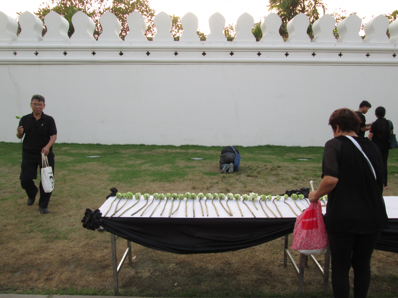 プミポン国王のご逝去に際して、ワットプラケオ周辺には献花台が置かれており、なかには壁に向かってお祈りをしている熱心な参拝者を見かけました。ワットプラケオ前で各種団体が国王の写真を無料で配布しており、折角の機会なので、参拝の記念にいただきました。