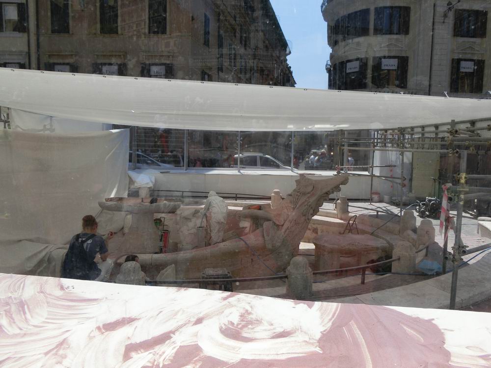 修復中だというのは行く前から分かっていたのですが、行ってみて実際に見てみるとやはり景観的にはイマイチでした。完全に覆われているわけではないので一応見えるのですが、それは修復している様子が見えるわけで、水が空っぽの泉を見ても感動はなかったです。