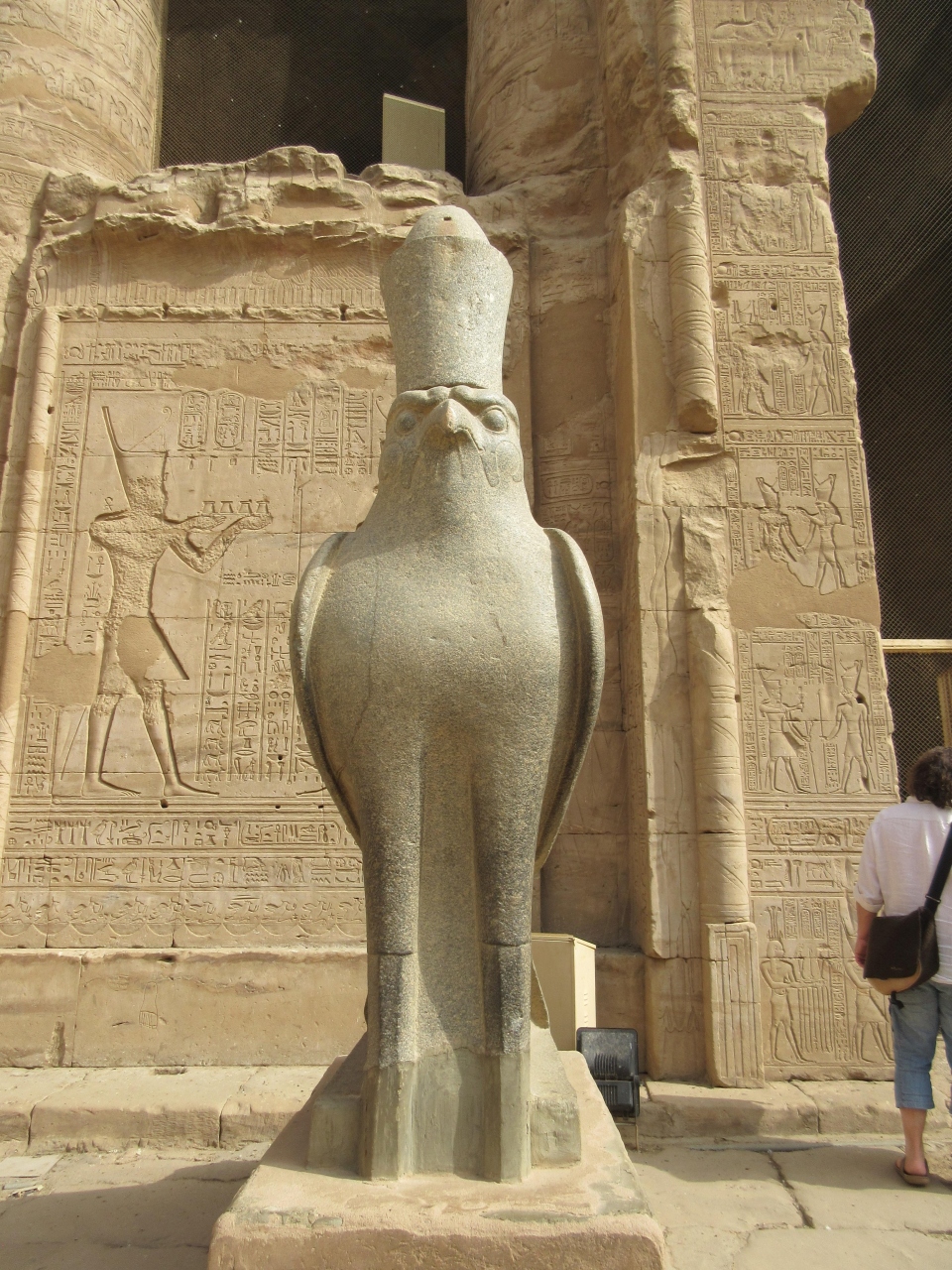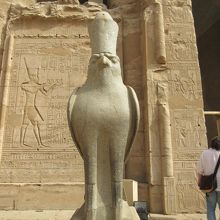 プトレマイオス朝時代(BC332-237)年に57年かけて建造された。その後神殿は吹き積もる砂漠の砂やナイル川によって堆積した川の沈泥で埋没する。発見した当時の写真を見る機会があったが、埋もれた中に柱が見えていた。発見者はさぞ驚いたことだろう。ハヤブサ神なのでホルス神の形は鳥である。神殿の中に像がある。レリーフが見事である。