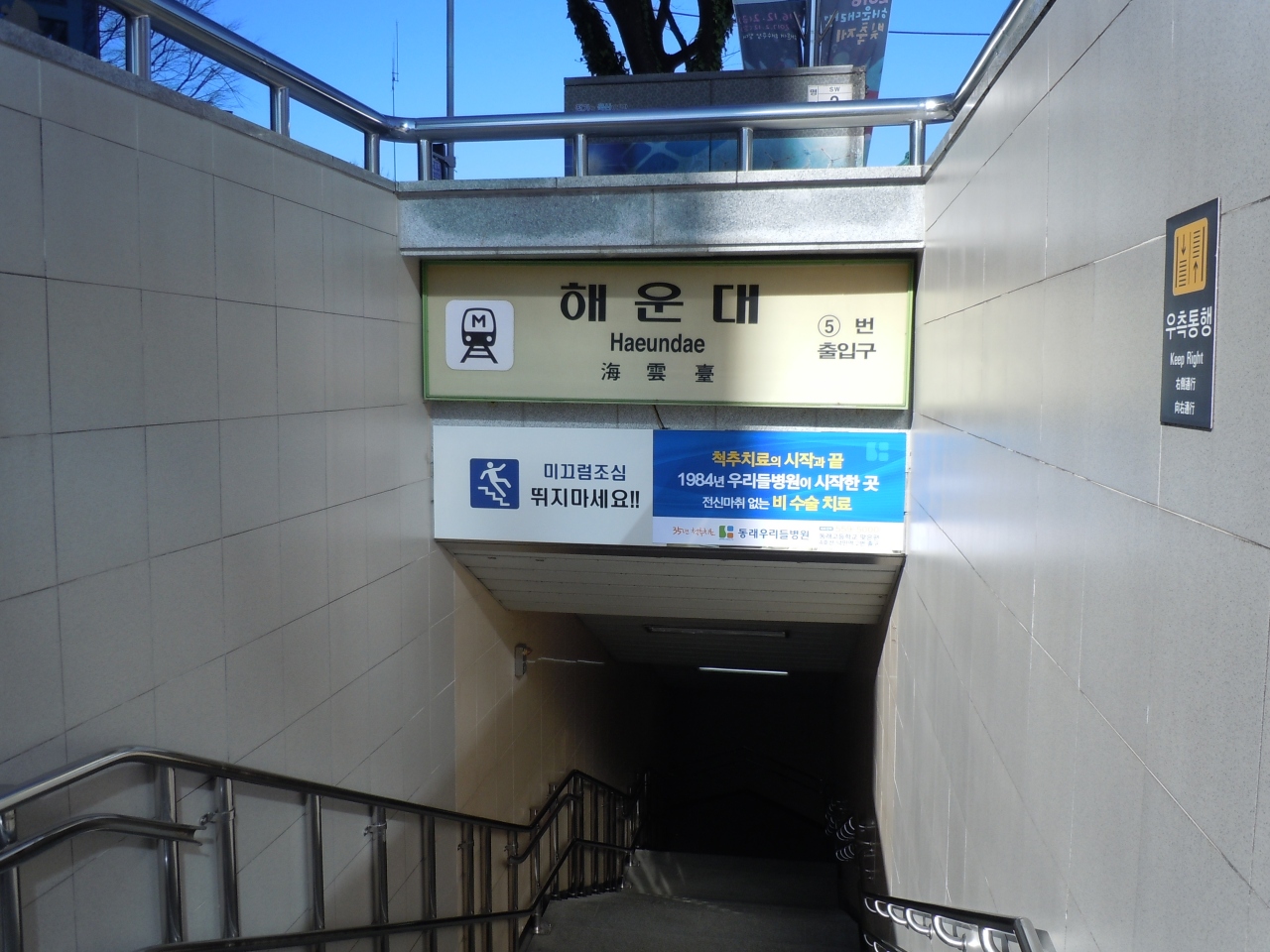 海雲台ビーチからメインストリートを歩いてすぐ。ここ海雲台駅から2号線は四面駅をとおり、空港方面に行くので便利だが、駅の数は多いので、時間がかかる。