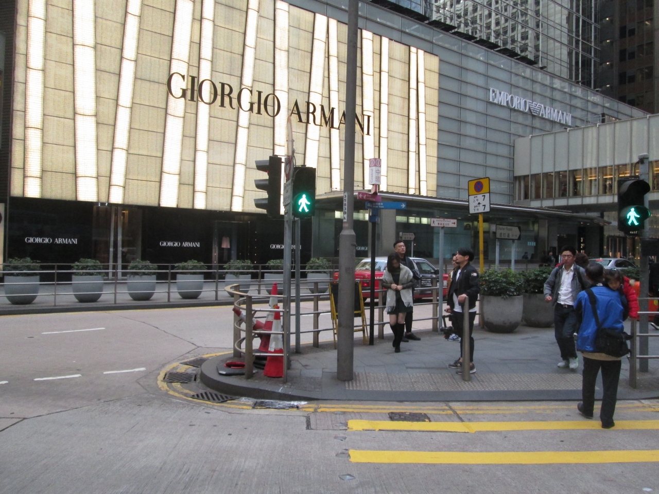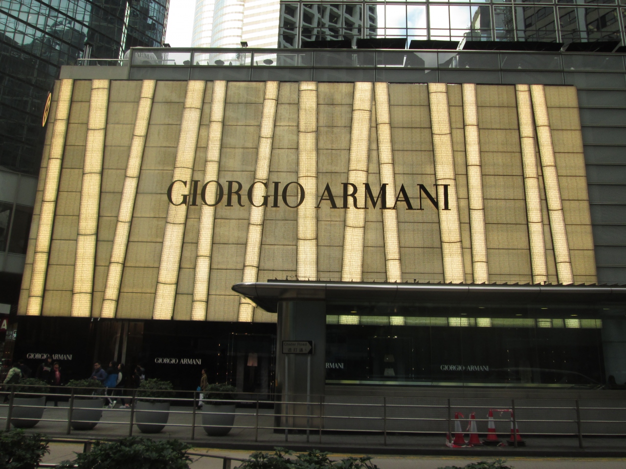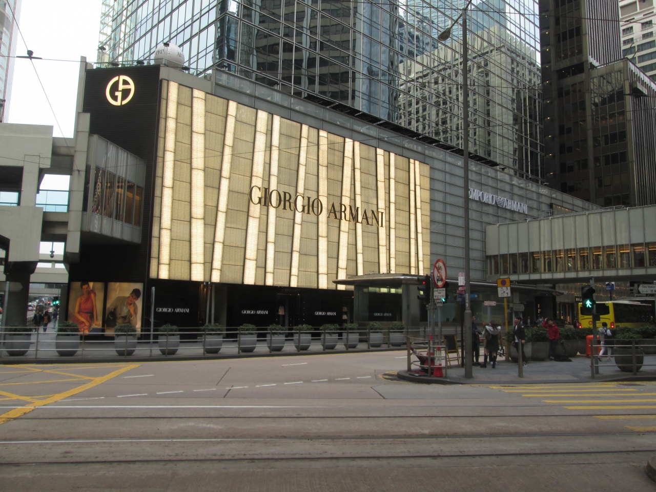 地下鉄セントラル駅の真上にあります。駅から地上に出ると派手なアルマーニの看板が見えます。G階から2階までの3フロアが売り場面積でした。館内には、ジョルジオ、エンポリオ、カーサ、フラワースなどがひとつのビルに入っておりアルマーニづくしでした。