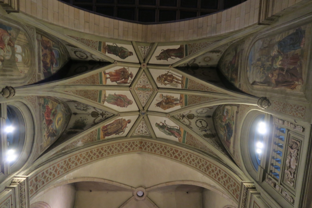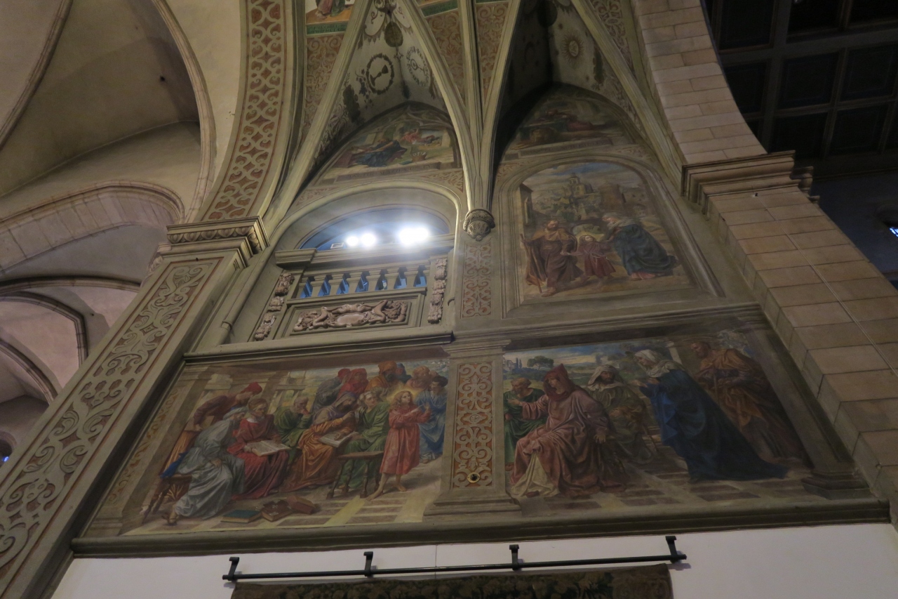 中に入ると、祭壇は小さい! マリア様だか、女王様なのかはわからないが、白い像がぽつんとあり、ちょっと拍子抜けする。 が、両サイドの本陣に描かれた宗教画や途中のアーチ裏にかかれたフレスコ画、またパイプオルガンを支えるテラスの彫刻などとても見事だった。