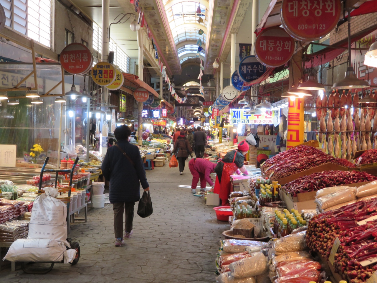 地下鉄1号線釜田駅とKORAIL釜田駅のそばにある大きな市場です、アーケード街になっていて快適に歩くことができました、農産物・海産物の扱いが中心で、新鮮な物が並んでいました、日本では見ることが出来ない物も販売されています、見ながら歩いて楽しかったです、朝鮮人参が束になって売られていました。
