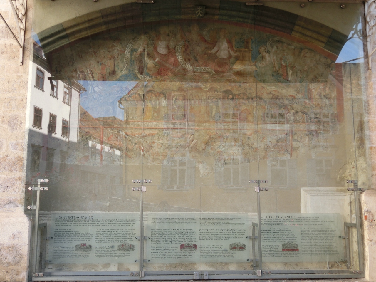 ドームはゴシック様式の古い建物で、建物の南側の外壁には古いフレスコ画が残っています。しかしフレスコ画の下半分は剥落していました。絵は保護のためガラス板で覆われていましたが、外部の景色がガラス板に写り込むため非常に見辛かったです。