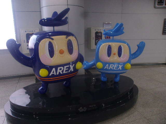 ICNとソウル市街地とを結ぶAREXの空港駅は、空港利用者が多く経由する駅ですので、既存の皆様のご投稿で事足りることは多いかと思います。ホームのある地下まではかなり深く潜りますが、ホーム上にあまり見所がないので、記念撮影スポットとしては、改札を入ってすぐ脇にある、怪しげなAREXのマスコット前をお勧め致します。