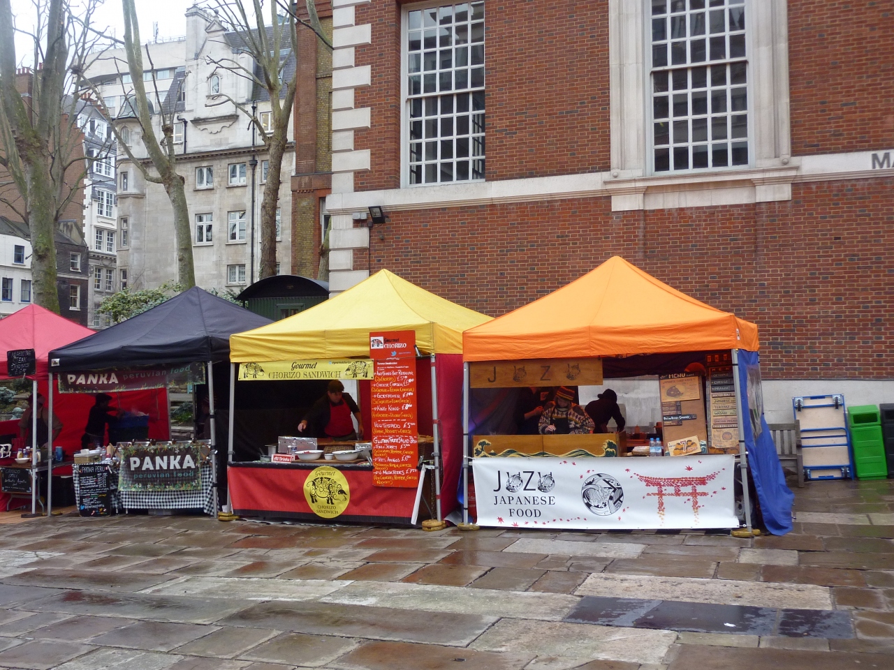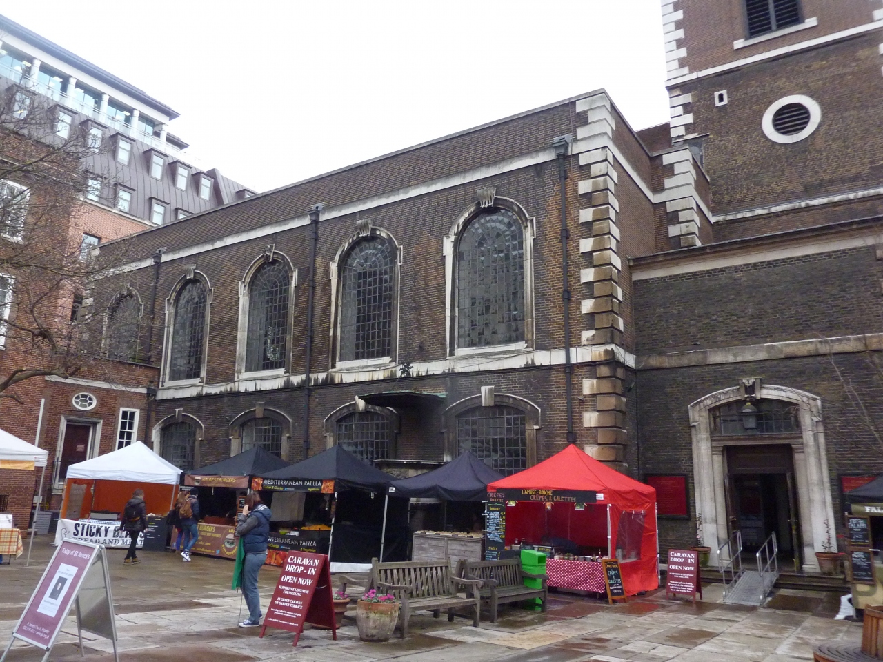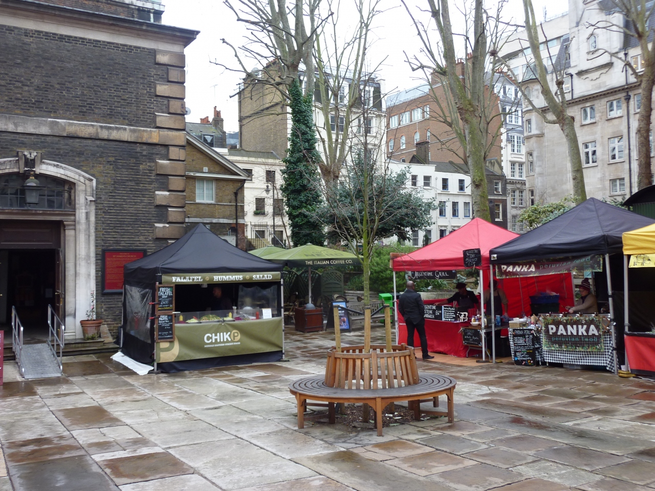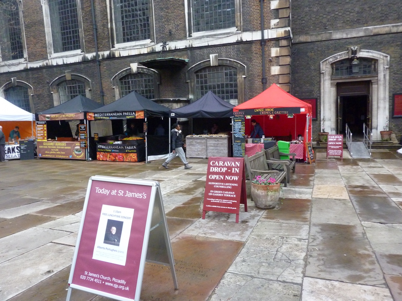 ピカデリー通りにあるレンガ造りの教会です。王立芸術院の斜め向かいにあり、通りすがりに覗いて見ると、教会前の広場には屋台が並んでいました。世界各地の料理屋台で、タコ焼きもありました。