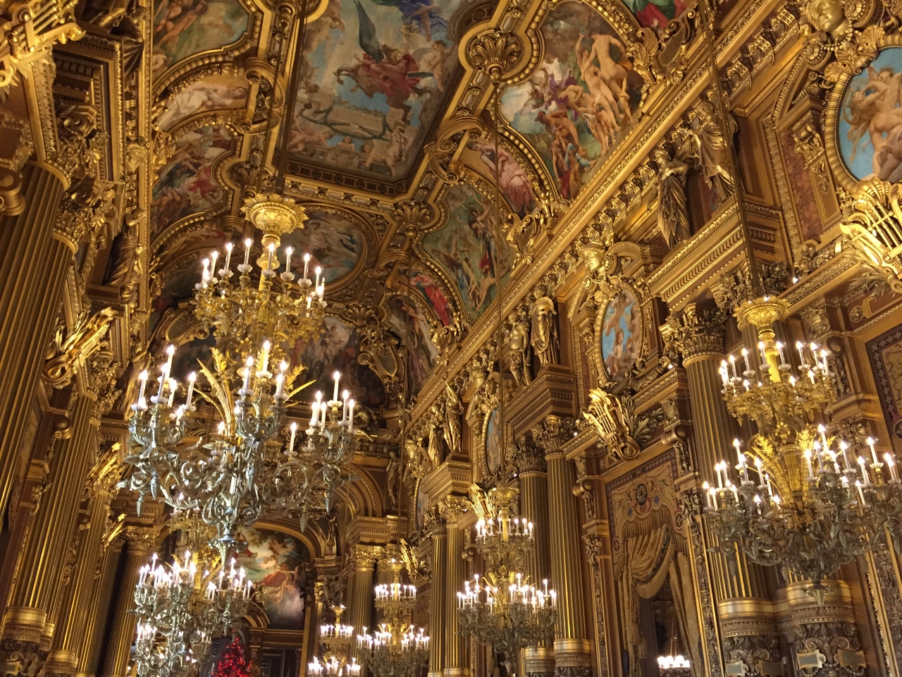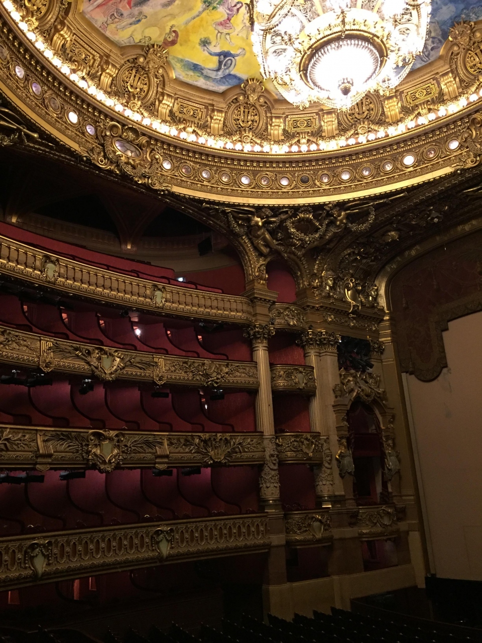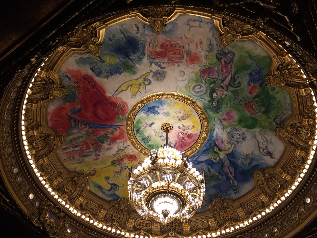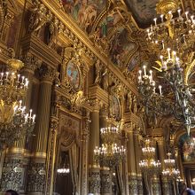 豪華絢爛なホワイエや、客席も見ることができ、見上げるとシャガールの天井画や7トンのシャンデリアも見ることができます。
