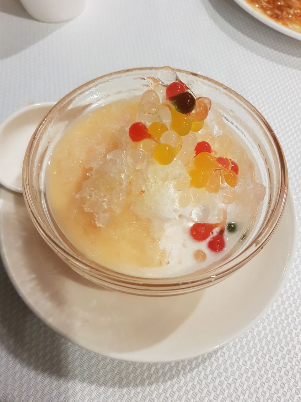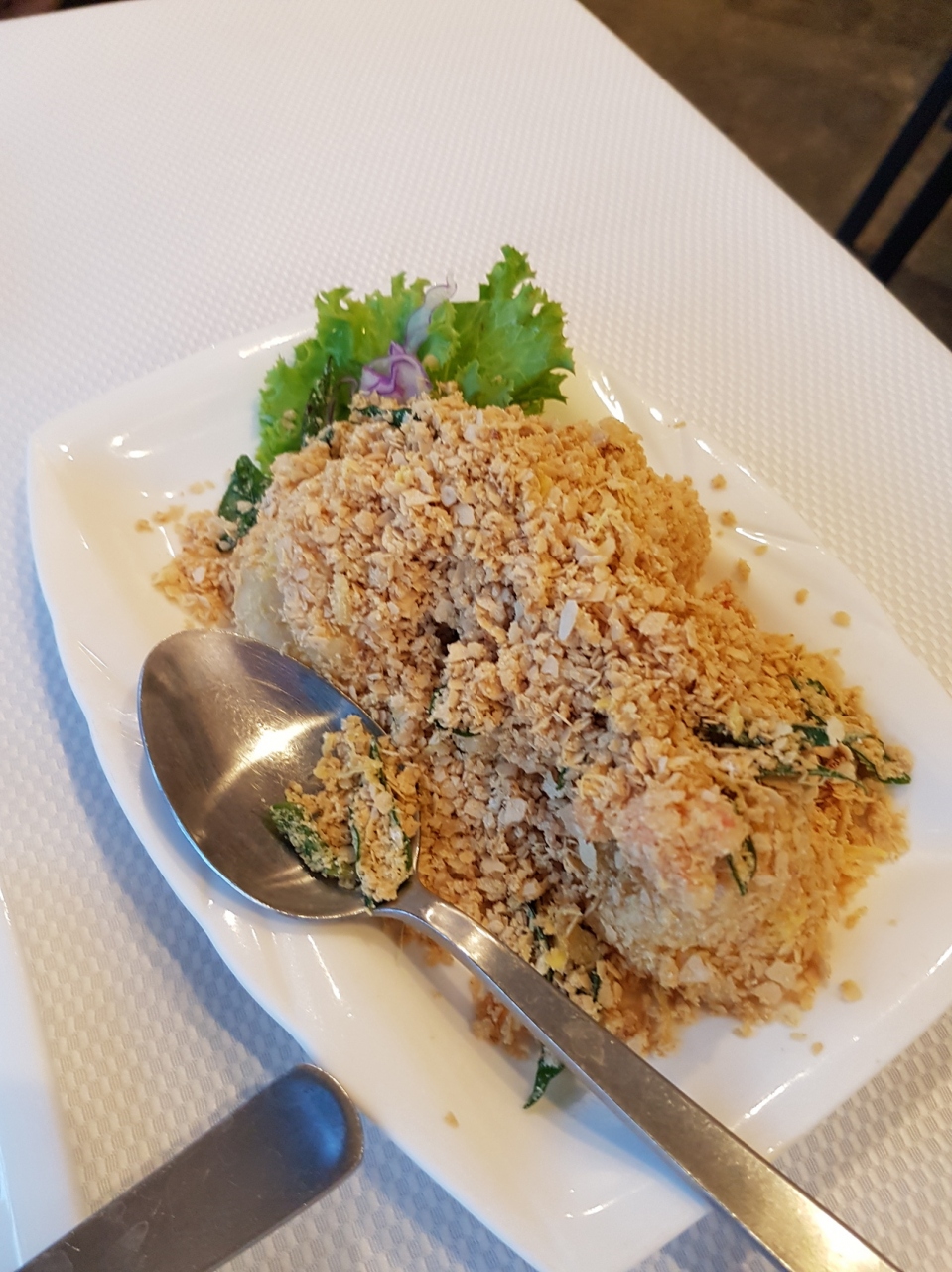 海老のシリアル仕立て、野菜炒め、シーフードスープ、チリクラブ、シーフード炒飯、デザート