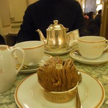 コーヒーと紅茶、モンブランを一つ頼んで二人でシェアしました。濃厚な味は日本と同じでアンジェリーナの味でした。