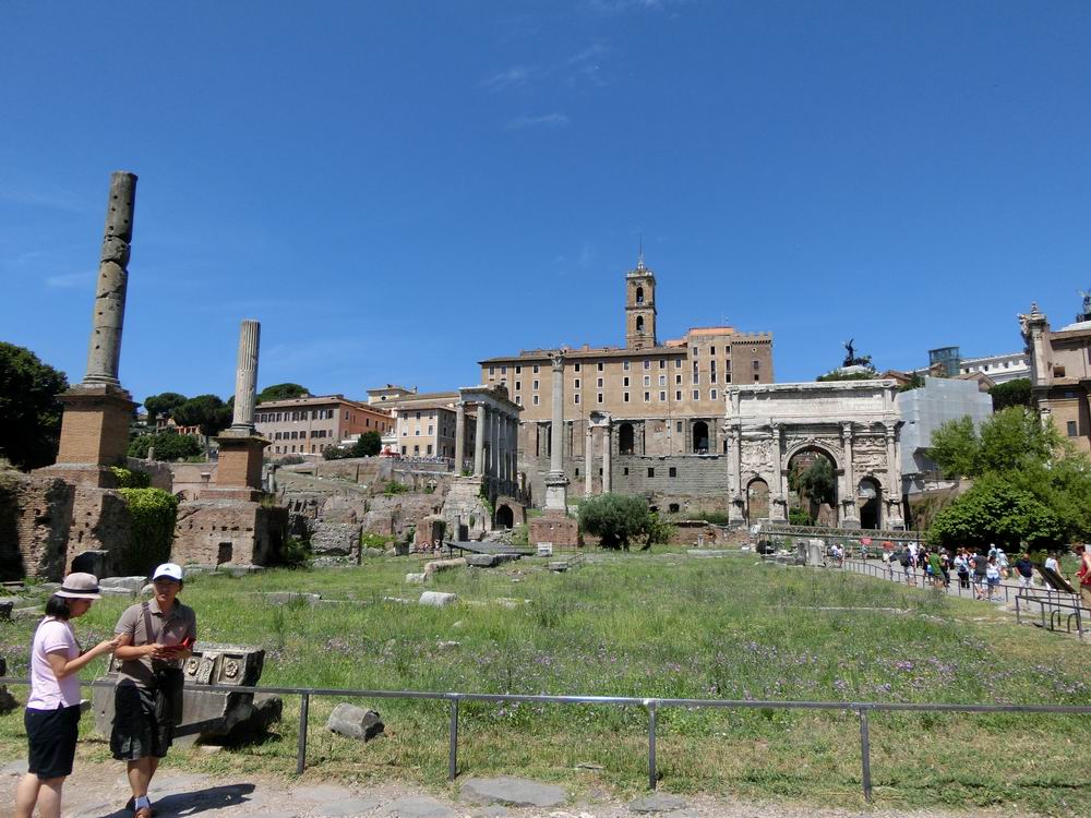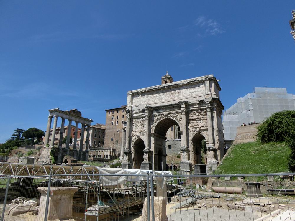 フォロロマーノの西の外れにある凱旋門。中央の大きなアーチと左右両脇の小さなアーチの計3つのアーチを持ち、中央と左右のアーチが横のアーチで繋がっているという構造。南側から門に近付くことは可能ですが、門の手前にフェンスが張られていて下をくぐることはできませんでした。