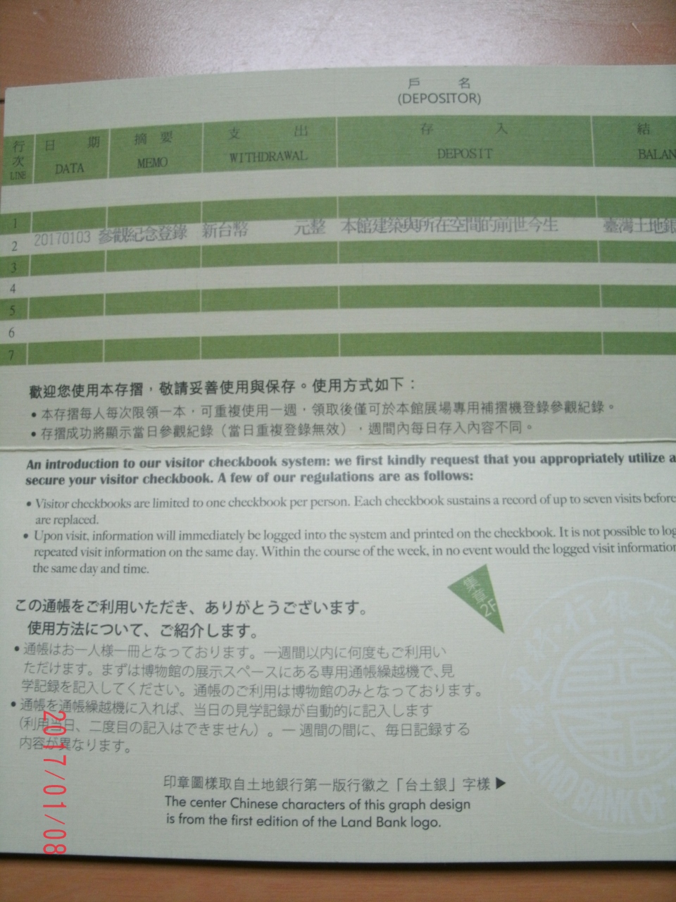 銀行の展示場所では通帳記入のような入館記録がもらえます。