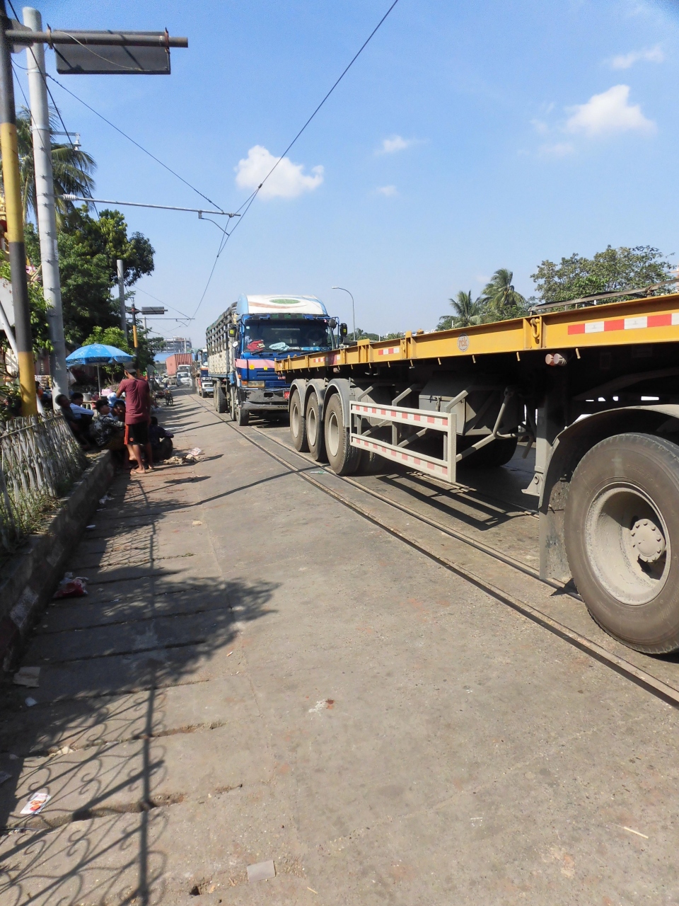 ヤンゴン環状線から出てヤンゴン川沿いに臨港線トラムと呼ばれている線があります。実際見てみると、殆どが道路内に線路があり(市内電車のイメージ)、その上を船から下ろされるコンテナを受けとる為の大型トラックが大渋滞を起こしています。