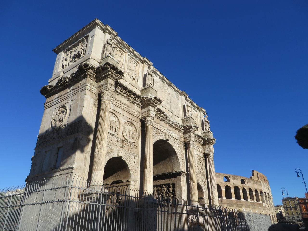 コロッセオのすぐ横に、この凱旋門があります。地下鉄のコロッセオ駅からは、コロッセオの裏側にあるので、コロッセオを回り込んでいく必要があります。凱旋門の周囲は折で囲まれているので、凱旋門に触れたり、下をくぐったりすることはできません。