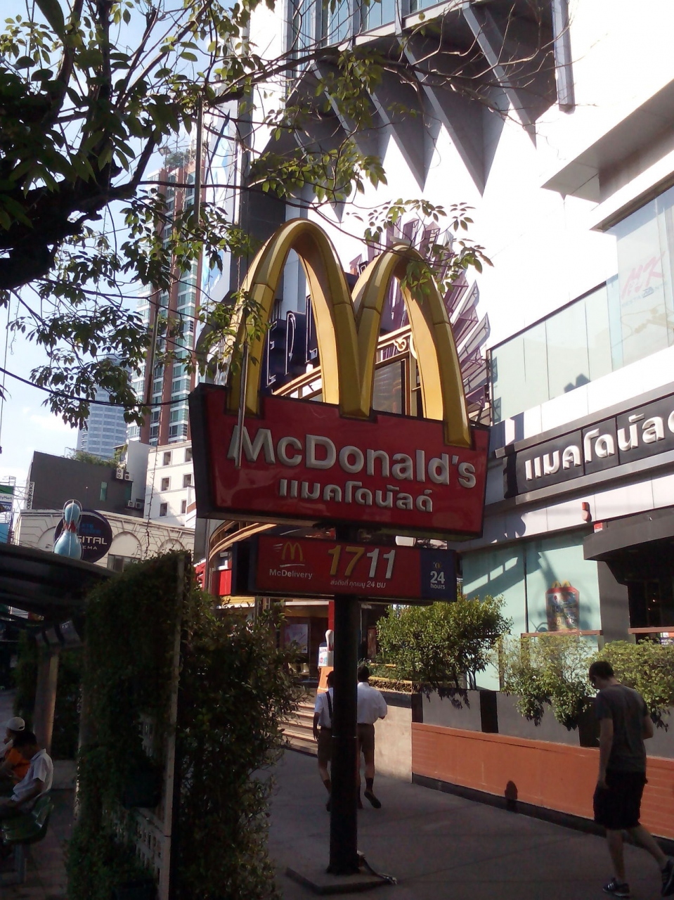 バンコクはもちろん、タイ国内に数多くのマクドナルドがありますが、スクンビット・ソイ19のロビンソンデパートの1階にあるマクドナルドは、旅行者にとって、とても利便性の高い場所にあります。BTSアソーク駅とMRTスクンビット駅にほぼ直結していますので、待ち合わせにも便利です。また、どんなに安い商品でも、何か注文すれば、レシートのパスワードで店内のWiFiが40分間無料になります。