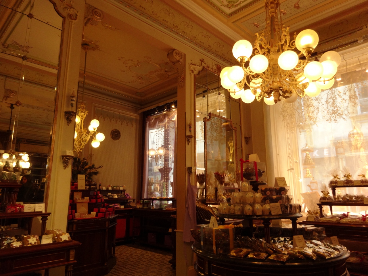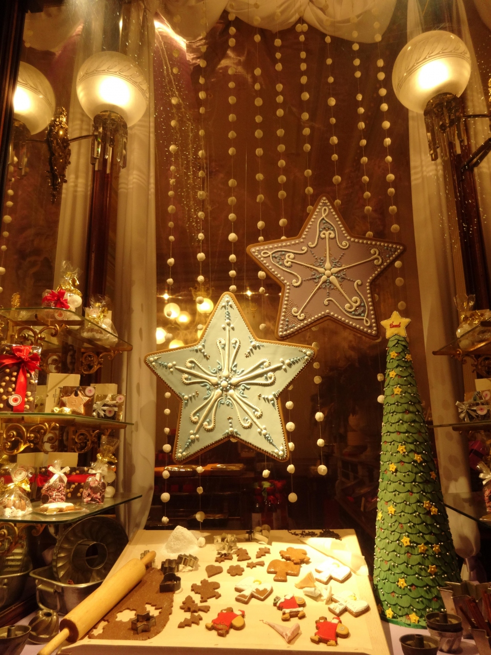 通りに面したショーウインドーにも、お菓子で作られたクリスマスの飾りがありました。内装も豪華で、良い雰囲気ですが、カフェ、ショップともに値段は高いです。