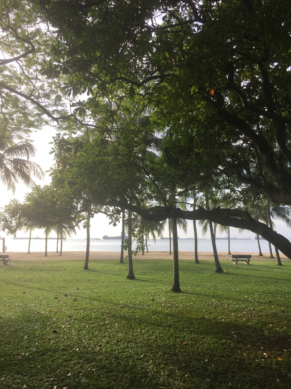いろいろな人が集まりそれぞれ好きなことをして過ごしています。ビーチもありシンガポールでリゾート気分を味わえます。海の方を見るとたくさんの貨物船が入港待ちをしている様子が見えます。
