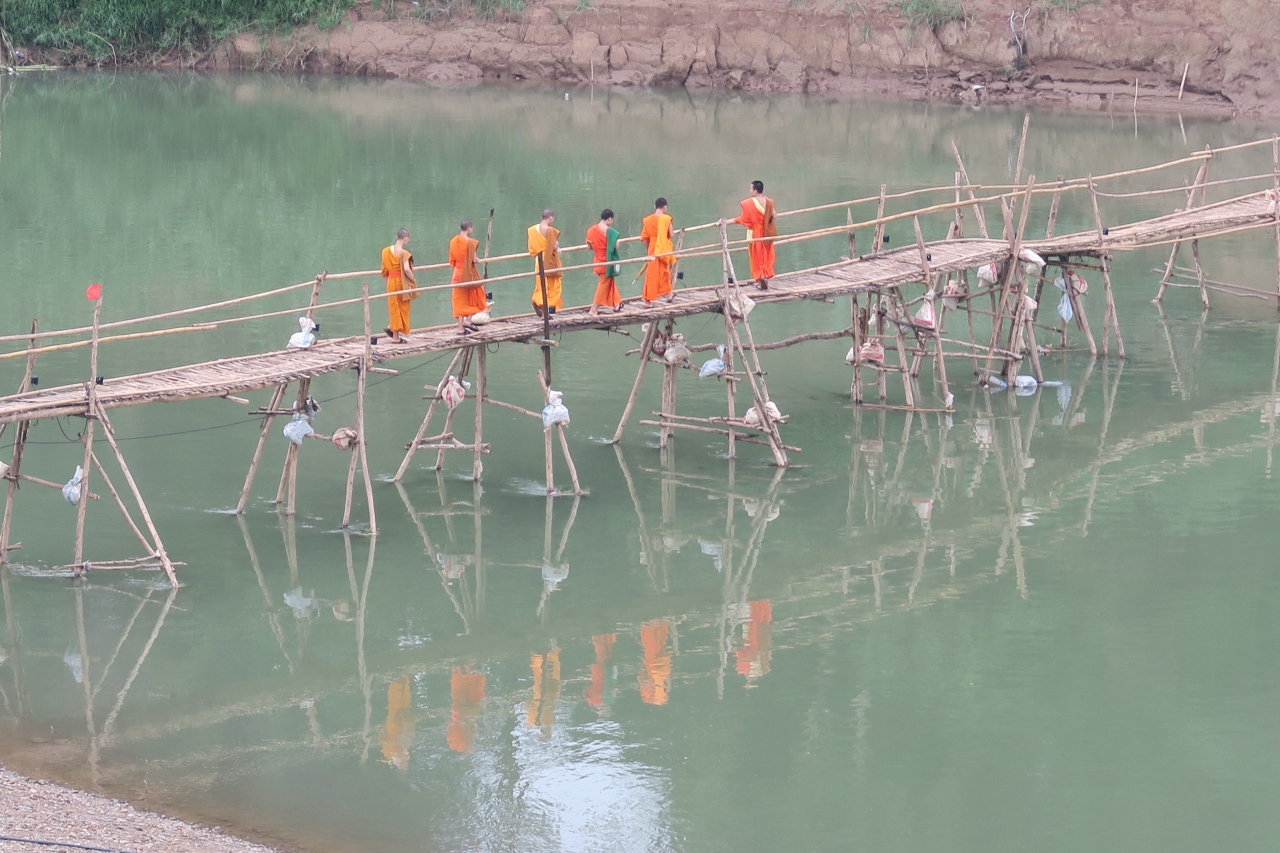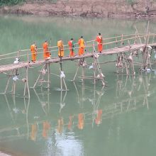 ルアンプラバンの街を流れるメコン川の支流で乾季には竹橋がかかっています。竹橋は毎年建築されるそうで、メンテナンス費として通行には1日5,000Kipがかかります。歩くと竹がしなりドキドキでしたが、印象深い思い出になりました。川はそんなに深くないようで欧米人と思わしき観光客が泳いでいました。