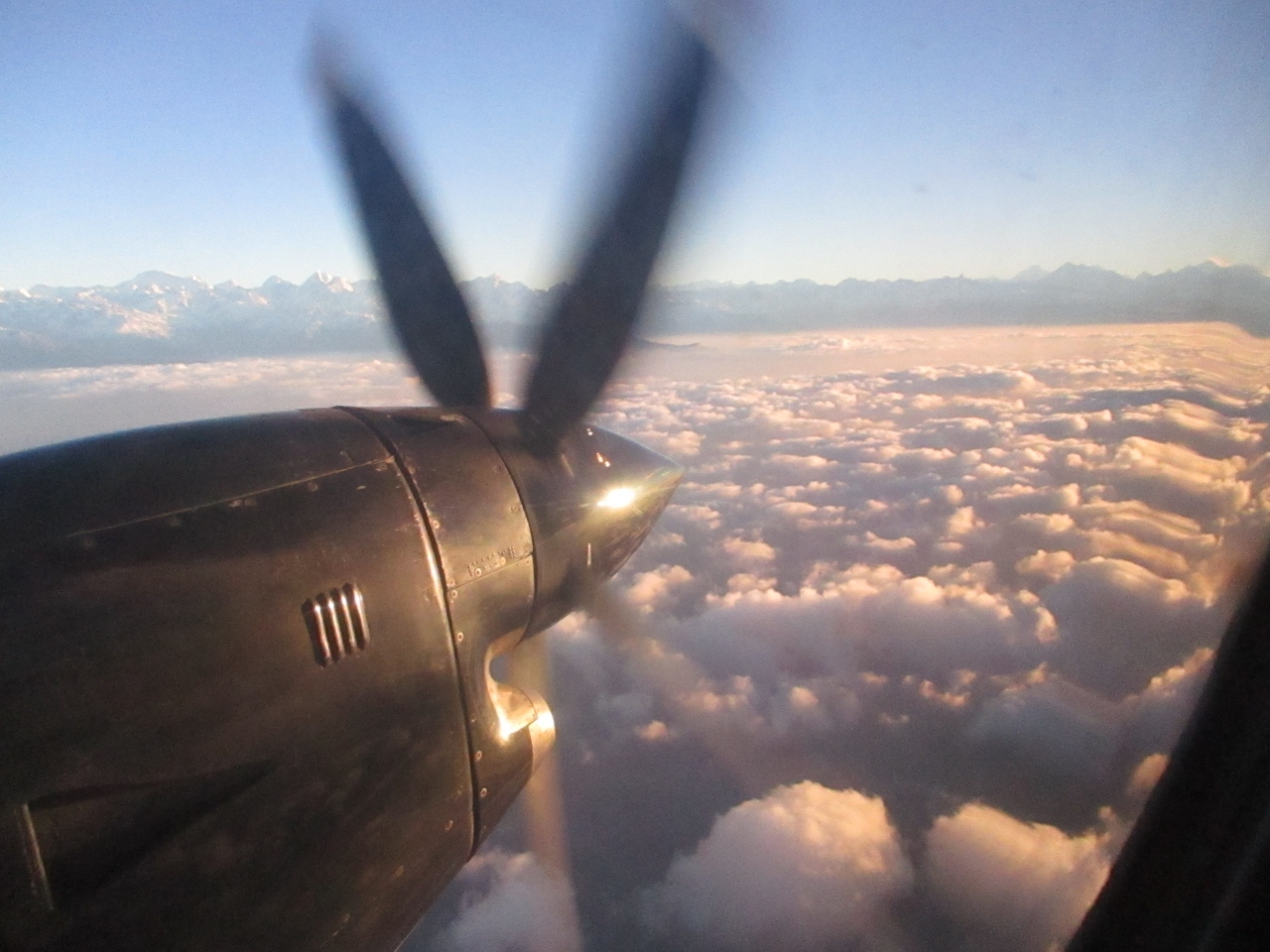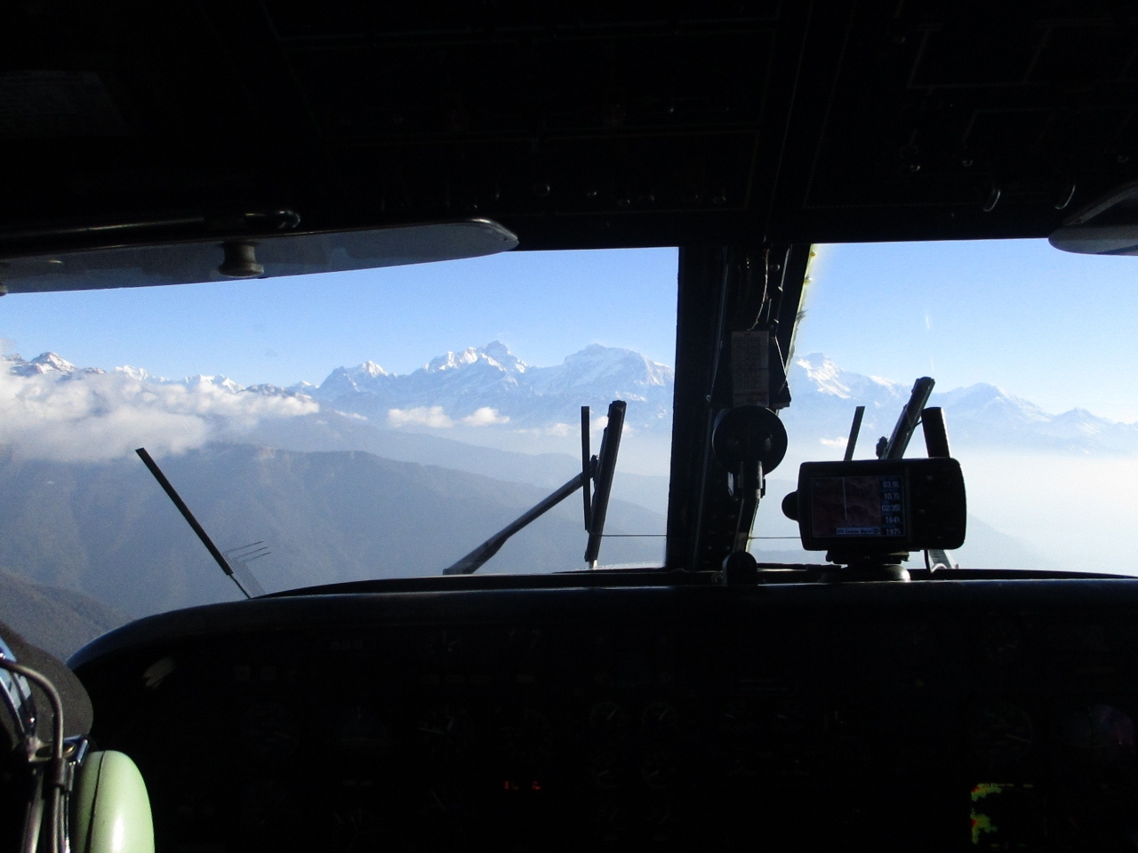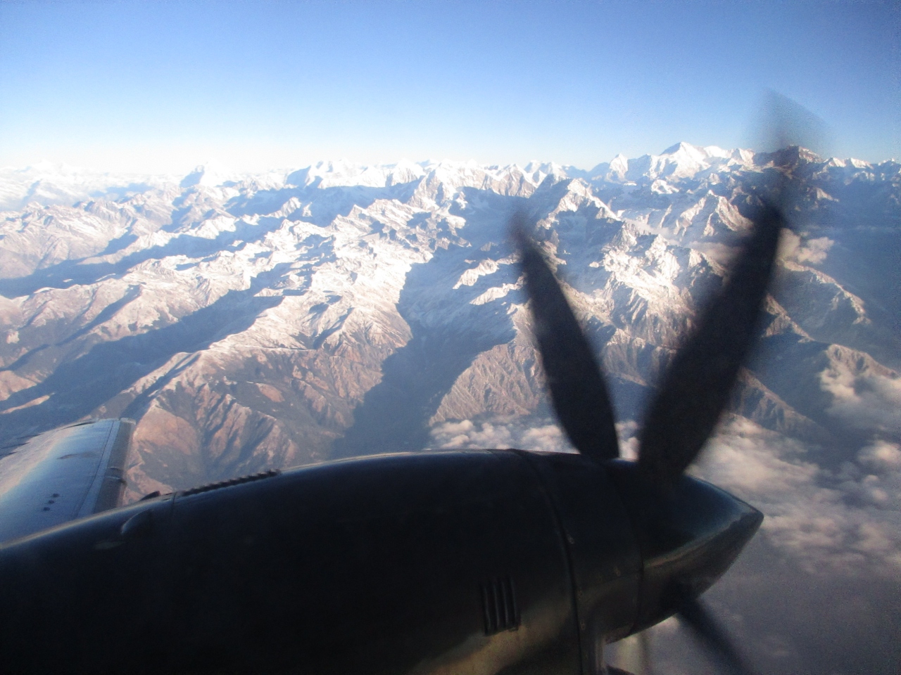 定期便では1+2席の10列で30人程度乗れる飛行機ですが、窓側のみの19席(前から左3番目は窓が無い)での利用になり、行きは左側、帰りは右側に山脈が見えましたが、帰りのほうが旋回の関係上ヒマラヤが近くに見えました。