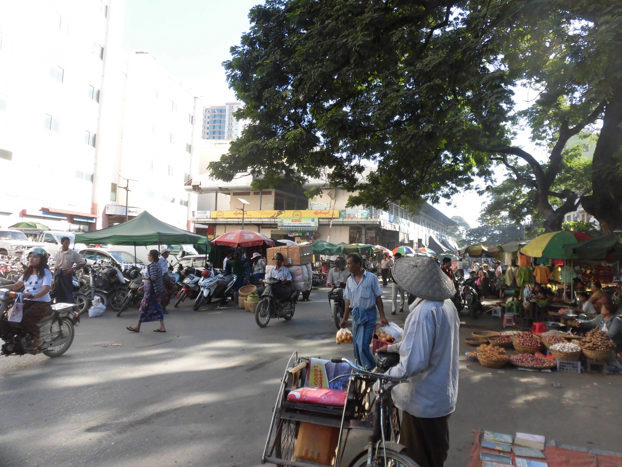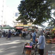 王宮の南西の角に近いところにあります。観光客向けではなく、現地の人の日用品から生鮮品も売っています。建物の中は衣料品が多かったです。野菜、果物、魚などは外で商っています。活気があってなかなかお勧めの市場です。