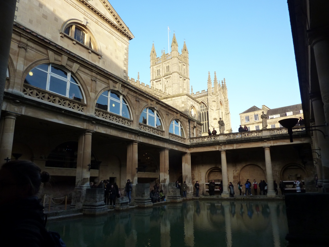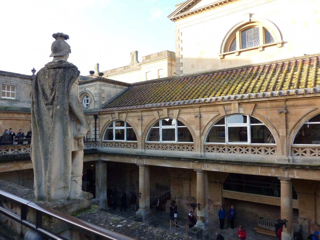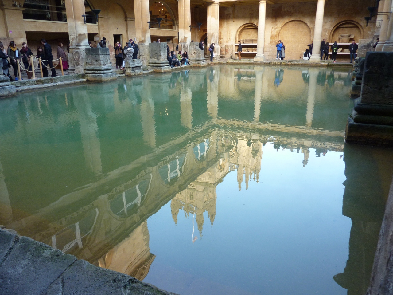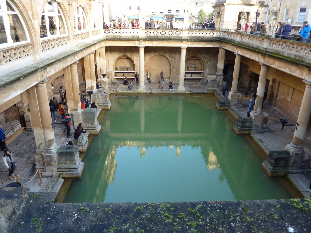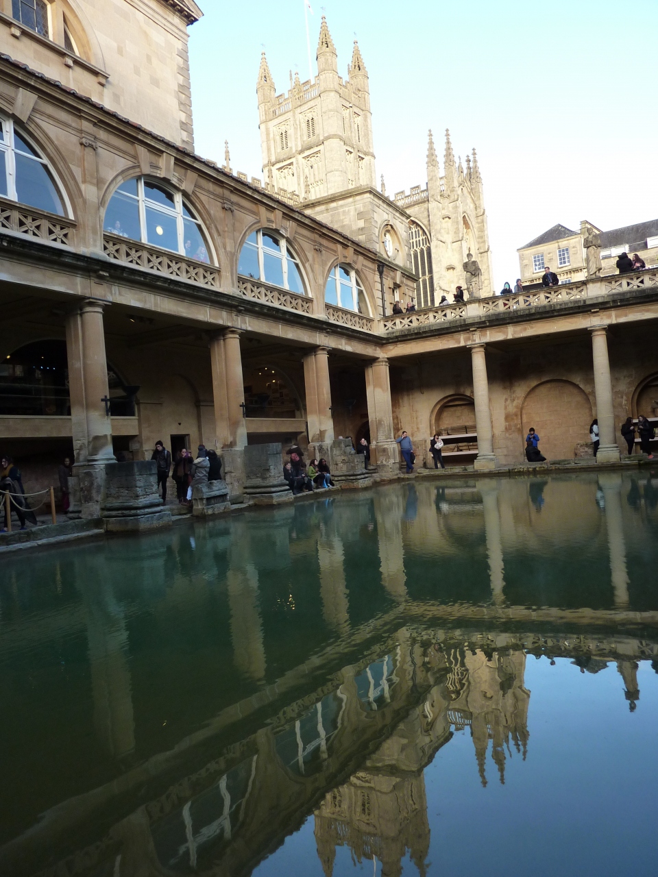 ローマ時代から続く緑色の水を溜めた大浴場で映画テルマエロマニの世界を思い起こさせてくれます。周囲をローマ戦士の彫像で飾られたテラスで囲み、見事な柱で回廊を設け、大きな四角いプールのようなバスになっています。水面にはバース寺院が写り込む姿はよく考えられています。