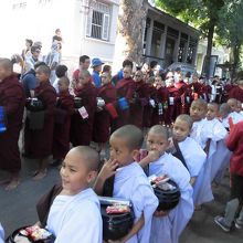 食堂に通じる道を、1000人を超える僧侶が歩いていく姿は、なかなか印象に残ります。托鉢も兼ねているので、沿道の人が色々寄進しています。中にはドル紙幣をばら撒いて(?)いる人もいて、あまり宜しくないのではと思ってしまいます。