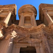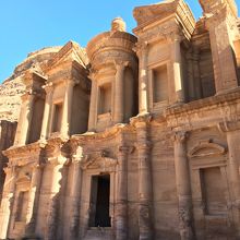 王家の墓から一気にエド・ディルへ向かおうと地図を広げたところ距離的には3km弱だったので30分程度で着くかと思いきや、よくよく見ると坂道階段を上ることがわかり、近くで交渉してきたベドウィンの少年のロバに乗せてもらうことにしました。30分ほど乗って11ディナールとチップに1ディナールで2,000円弱でしたが、記念にと乗りました。エド・ディルまでの道のりは予想以上に険しく、体重の思い私を乗せたロバも疲れていそうでした。しかし、朝日を浴びたエド・ディルは紅く美しく、はるばる来てよかったと思いました。団体観光客はここまで来ないため閑散としていましたが、石窟の目の前のカフェでのんびりしながら時間を過ごすことができ、贅沢でした。ロバに乗る際は気を付けましょう。崖や坂道を歩くためバランスを崩しそうになることもありますので、あくまでも自己責任にて乗ってください。