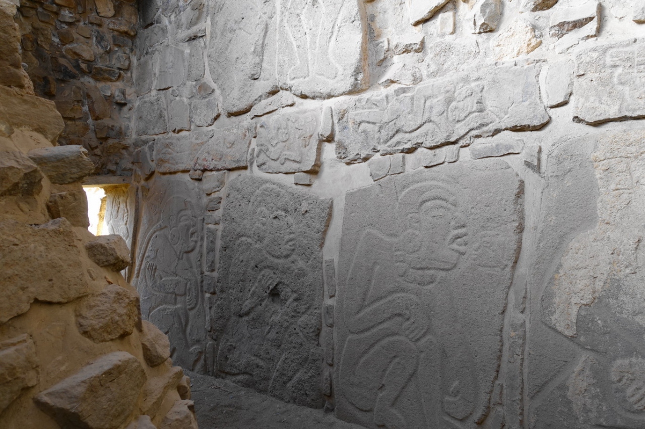 踊る人々のピラミッドと呼ばれている建造物。外側にレリーフがいっぱい並んでいますが、これらはレプリカ。本物は併設の博物館や、オアハカの文化博物館に収められています。