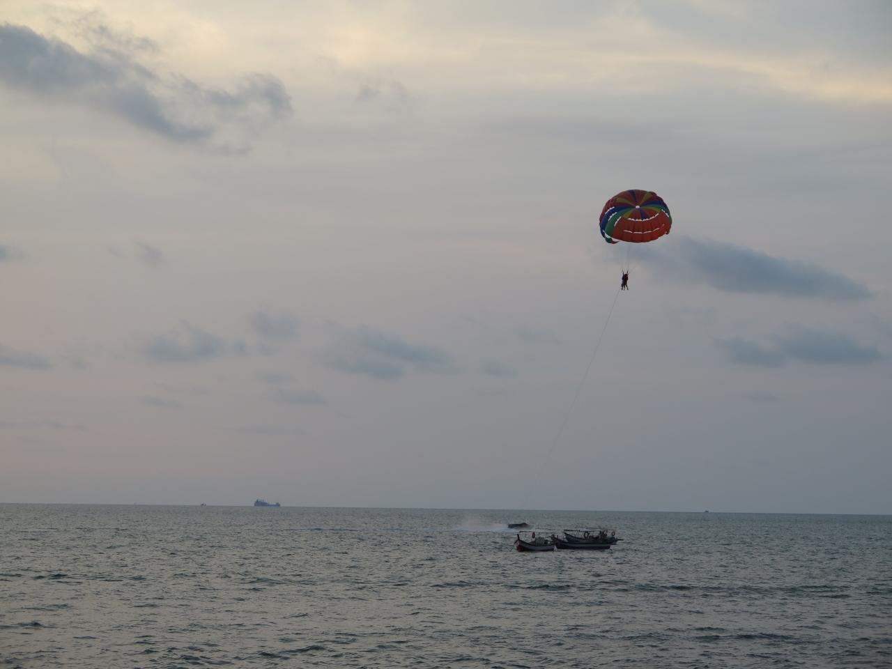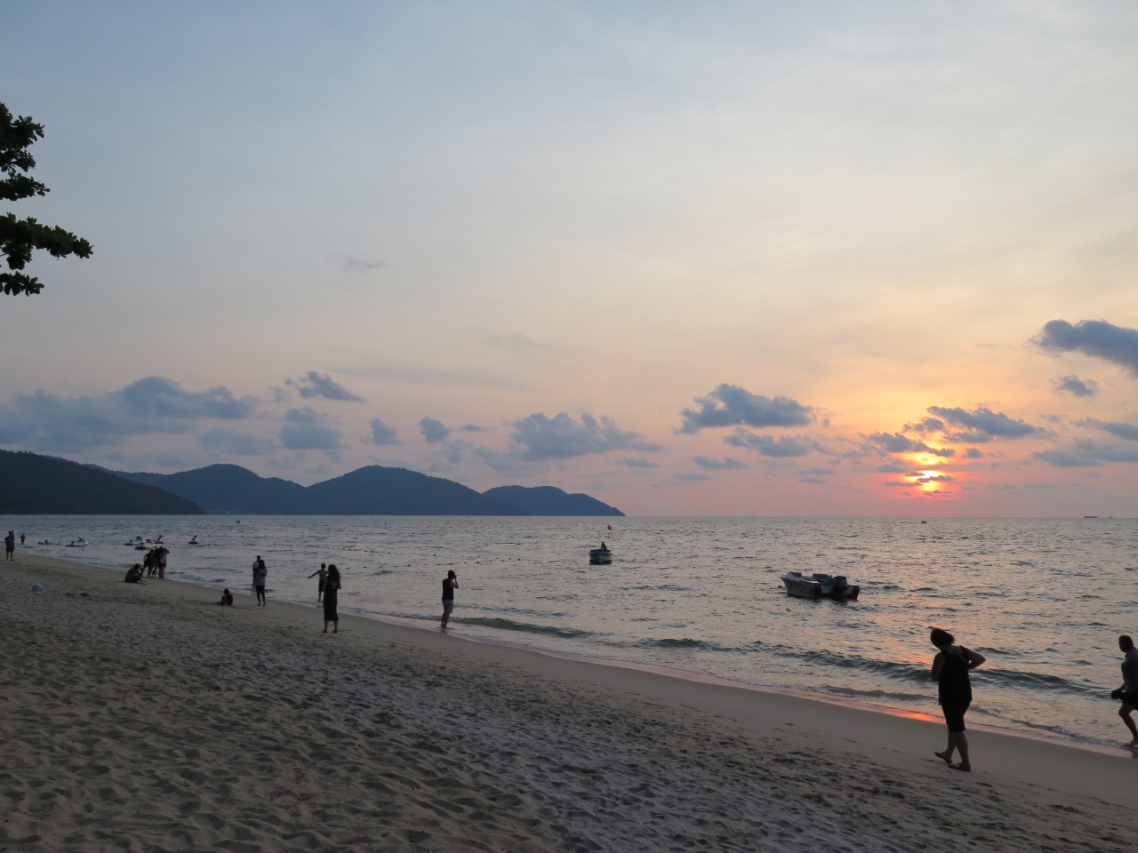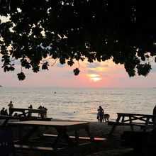 ホテル近くのペナン料理のカジュアルな店で夕食を食べた後、ビーチに出てマラッカ海峡に沈む夕日を時間を忘れて見ていました。海辺では、パラセーリングやバナナボートが全速力で走っていました。コーラスを歌うグループなど、心が洗われる風景でした。