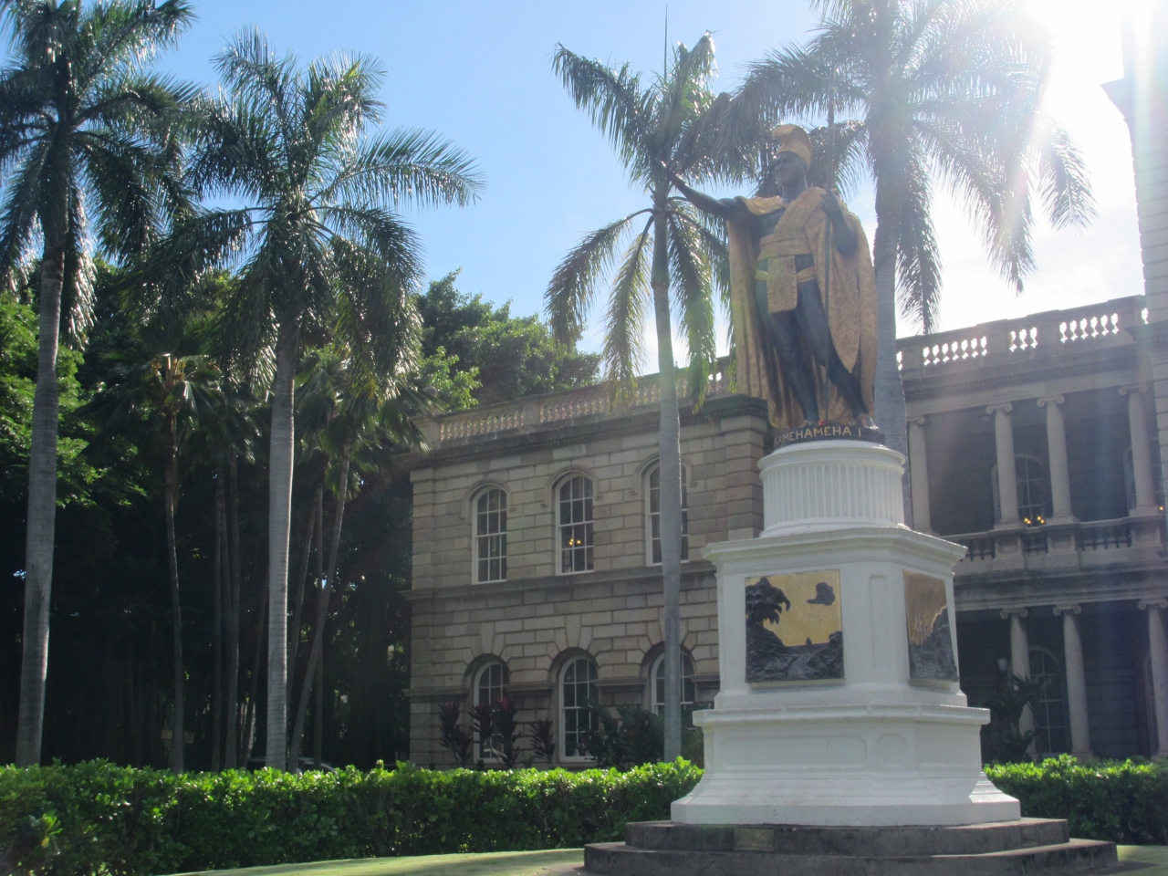 イオラニ宮殿の向かい側にあります。周辺はダウンタウンに近いので少し道路を外れると治安が悪そうなので明るいうちに。うちはチャーターツアーで連れて行ってもらいました。観光客が多い時と少ない時があるようです。カメハメハ像と一緒に撮ろうとすると西日は逆光になります。朝の方がいいかも。