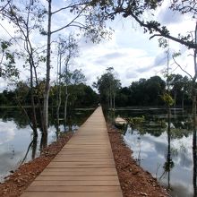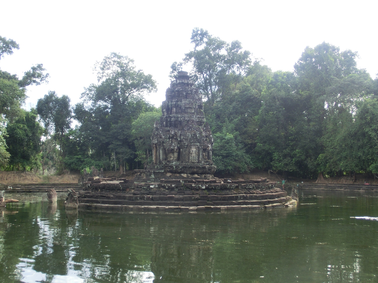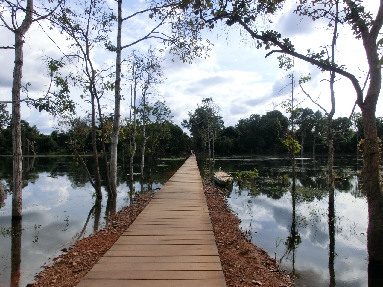 大回りコースをトゥクトゥクで回って、途中でニャクポアンに行きました。今までの遺跡群とはちょっと違います。まず大きな池の中央に木でできた細い橋を渡っていきます。また大きな池があり、その池の中央に祠堂が立っています。治水に対する信仰があるそうです。池の中にあるなんてちょっと面白い寺院でした。