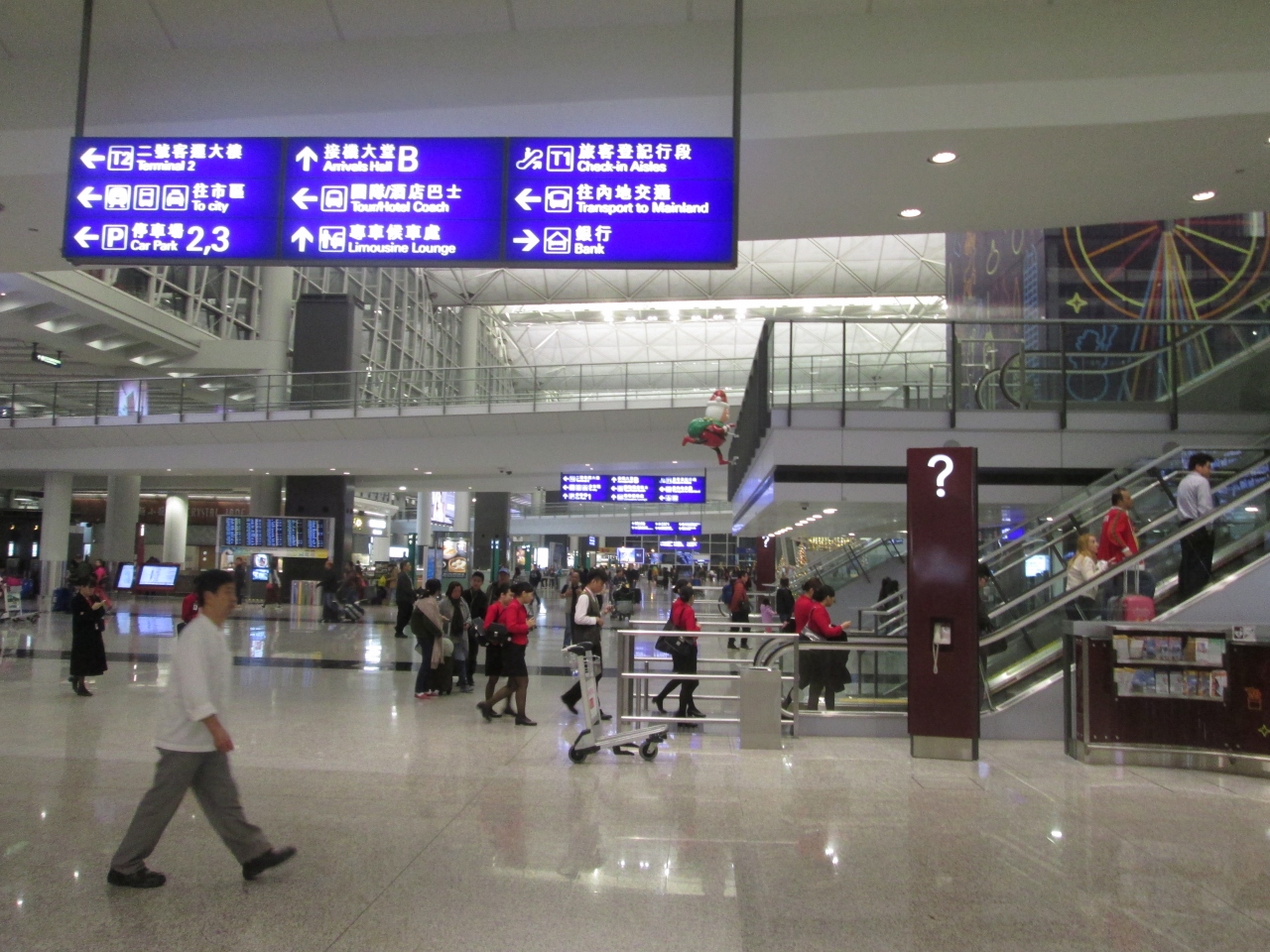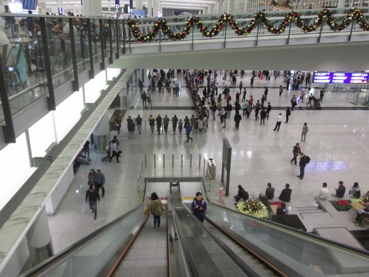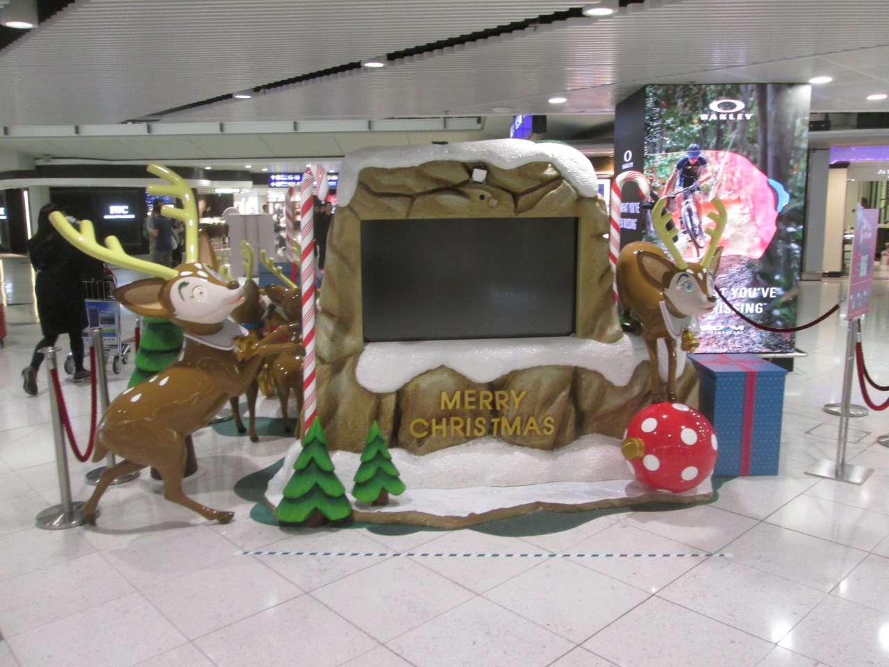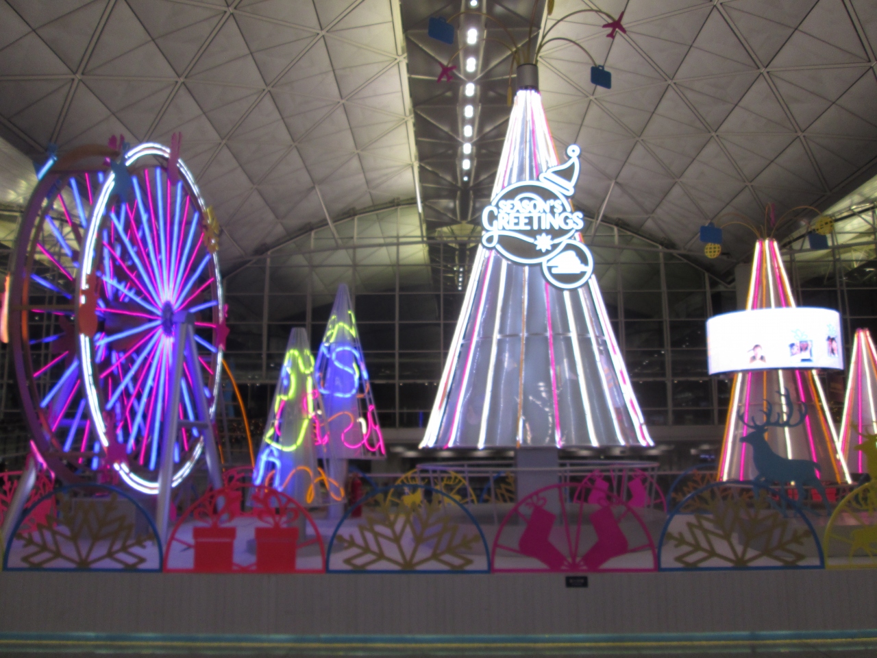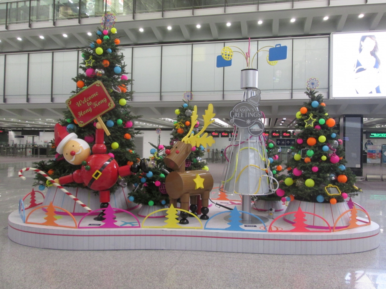 クリスマスの時期に香港国際空港を利用しました。大きいクリスマスツリーやスロープにはクリスマスのリースがリースが飾られていました。出発階と到着階の間には、遊び心いっぱいの展示物もあり、すっかり空港はクリスマスムードになっていました。