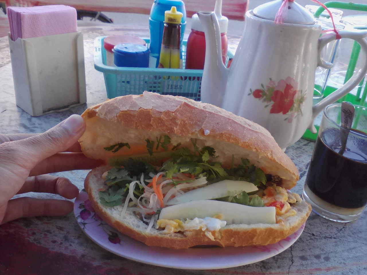 通りの角にあるから“コーナーカフェ”。名付けた人のセンスはなかなかのものだと思います。ここのサンドイッチの特徴はふわふわのスクランブルエッグが入っていること。やはりいつ食べてもおいしいです。テーブルの上には塩や胡椒、しょう油(もちろん現地のものです)が乗っています。サンドイッチ用のものではありませんがお好みで使うとよりおいしくなります。お値段は7000kipのまま。朝方は客がひっきりなしに買いにやってくる人気店です。もう少しおしゃれな店構えにして10:00までと言わず一日中やっていればかなり儲かるはずだと思うのですが、その辺の商売っ気のなさが好感が持てます。サワンナケートで一番おいしいサンドイッチ屋だと思います。今回も幸せにしてもらえました。