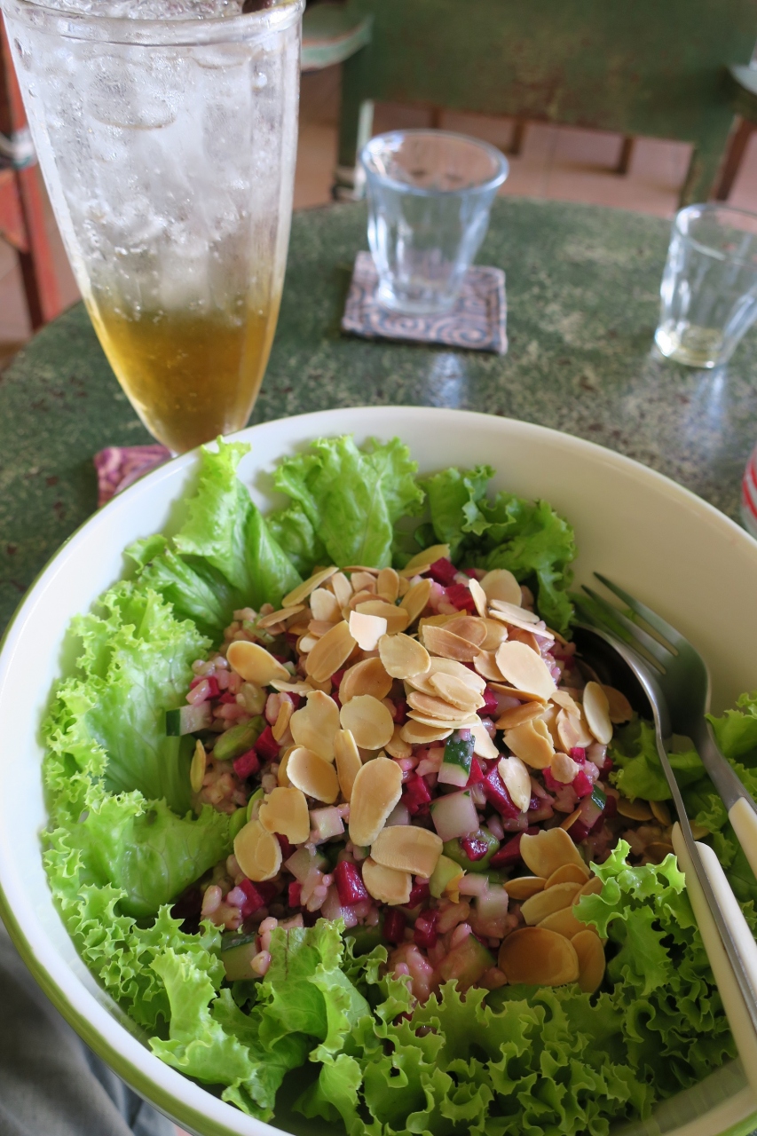 玄米サラダ(100thb)を注文。玄米に、ビーツ、枝豆、キュウリなどが細切れでミックスされ、アーモンドがトッピング、レタスの上に盛りつけられていました。さっぱりして、美味しくいただきました。