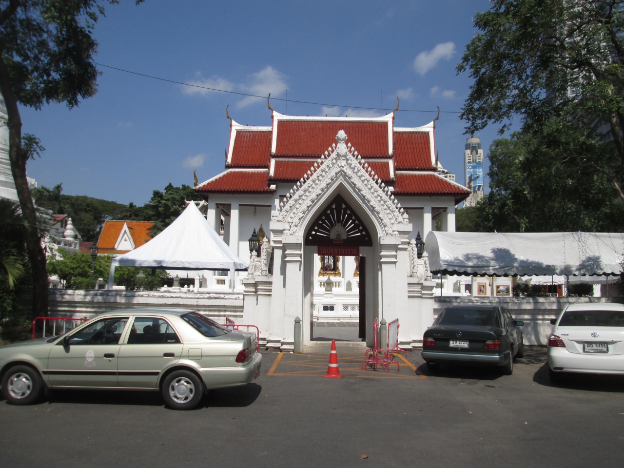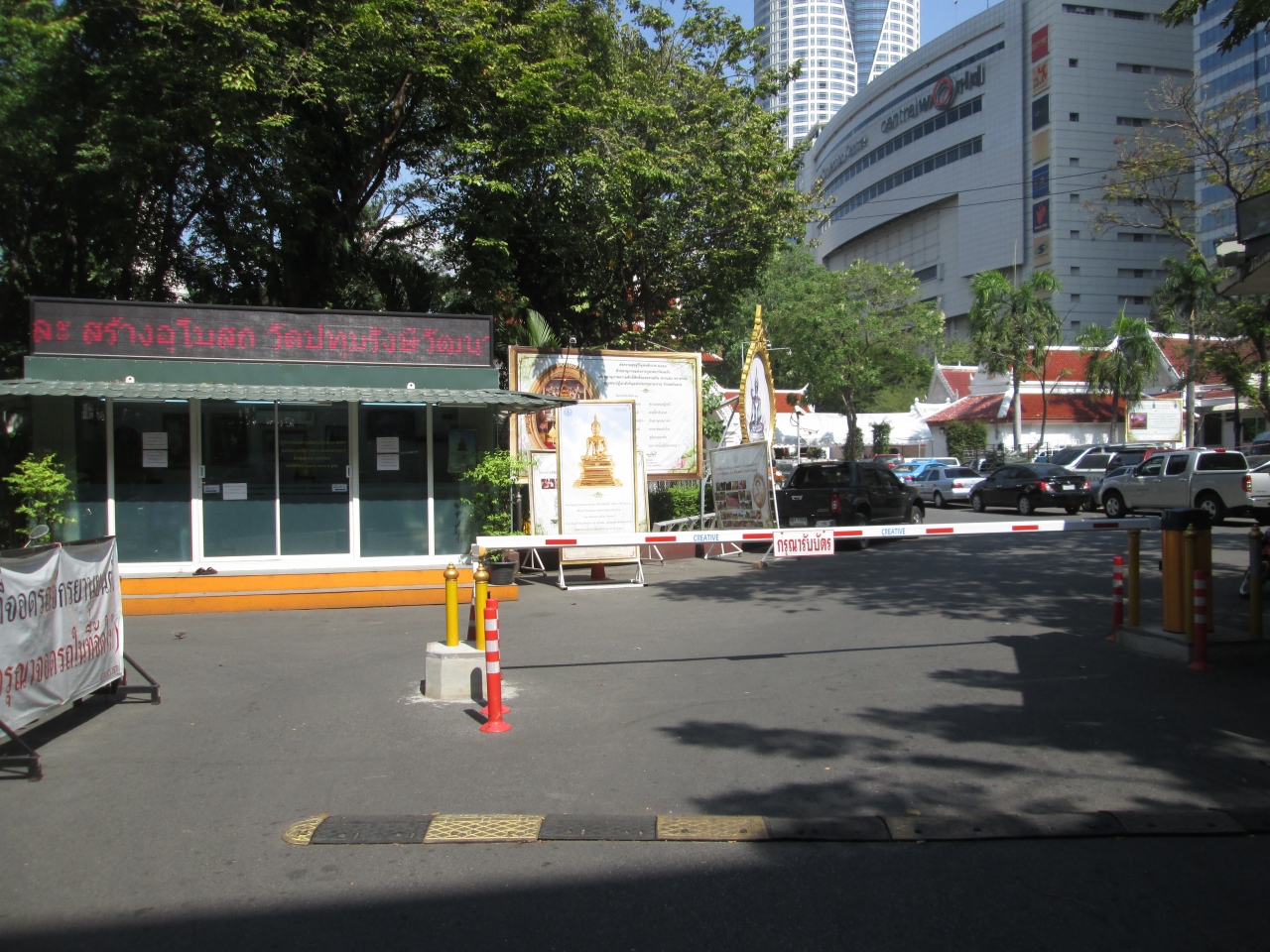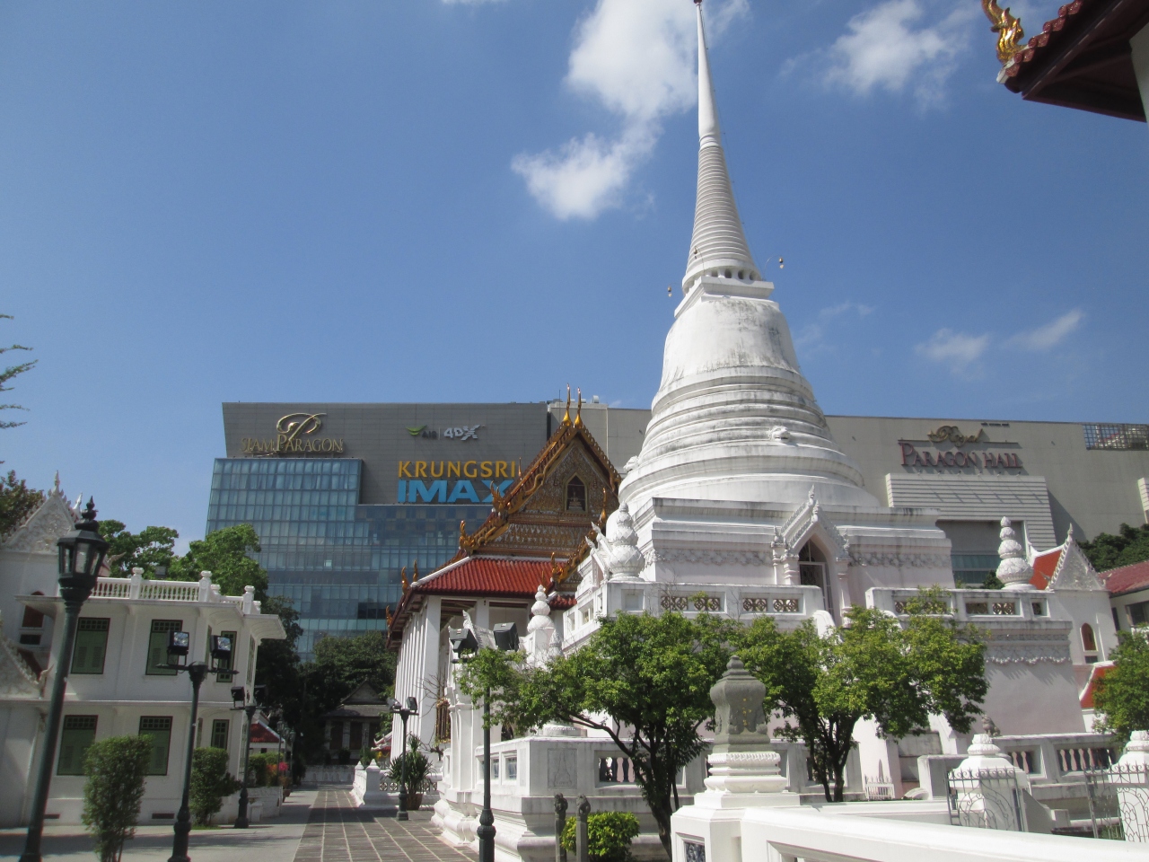 サイアム、チットロムのショッピング街、大都会の真ん中にポツリと寺院が出現します。バンコクではちょっと珍しい白い仏塔があり、何となく境内の本堂や建築物は白を基調にしているようです。また、人工的に造られた池があり、魚の養殖場になっていました。