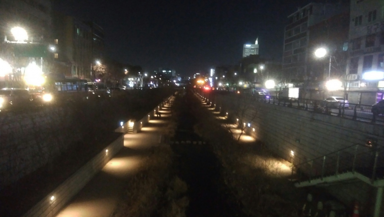 乙支路4街駅の4番出入口から行きました。地上出入口から50mぐらいですぐに到着します。川のすぐそば場まで降りることができ、遊歩道が整備されているので東大門から光化門近くまでぶらぶらすることができますが、冬場の夜は寒いのでかなり厳しいと思います。自分が訪れた1月は大寒波と重なっていたので、だれ一人歩いていませんでした。夜景はライトが明るすぎず暗すぎずで程よい明るさで、デートコースにするにはちょうどいい感じだと思います。